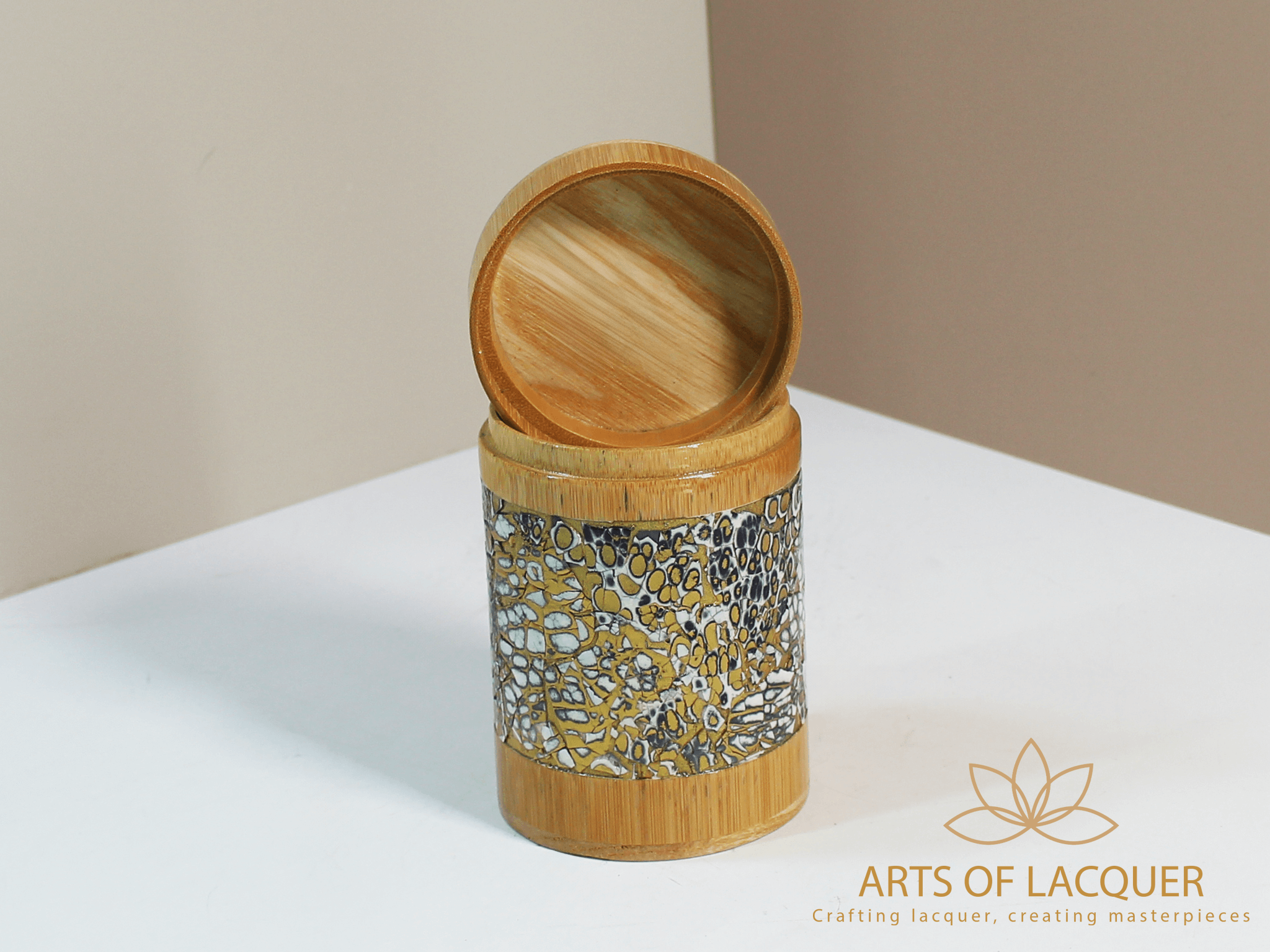 Sản phẩm trong hình là "Lọ Tre Sơn Mài Khảm Trai Họa Tiết Trắng Đen" từ Arts of Lacquer. Hộp có thiết kế tròn với nền màu vàng nhạt và vảy đen, được trang trí