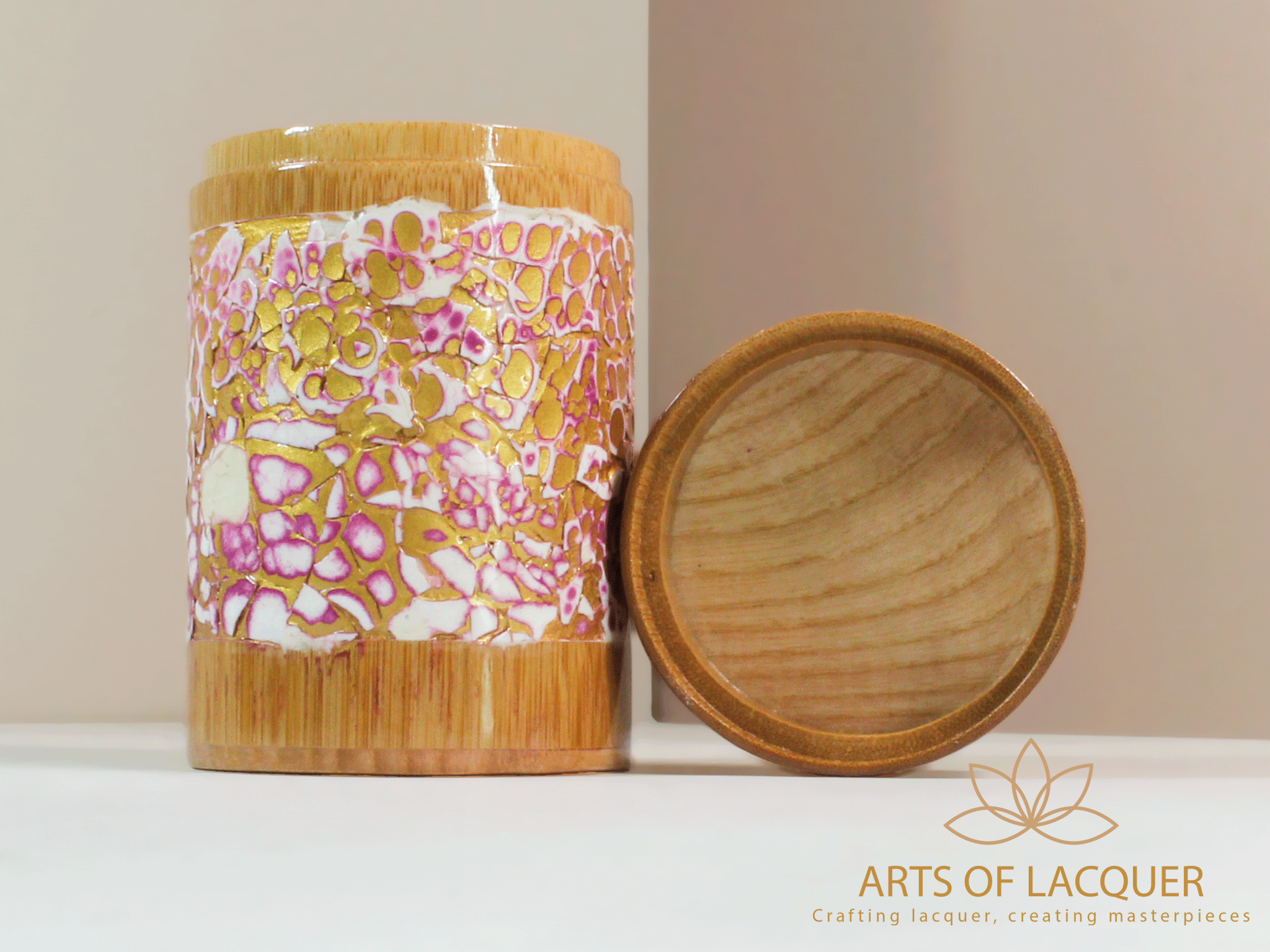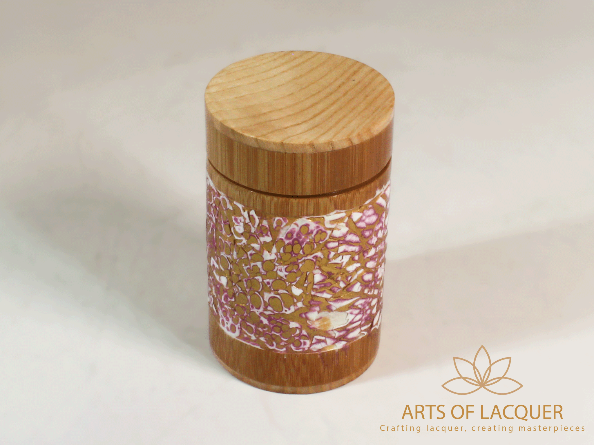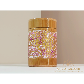 Sản phẩm trong hình là "Lọ Tre Sơn Mài Khảm Trai Tím" từ Arts of Lacquer. Hộp có thiết kế tròn với nền màu vàng nhạt và tím, được trang trí bằng hoa văn tinh