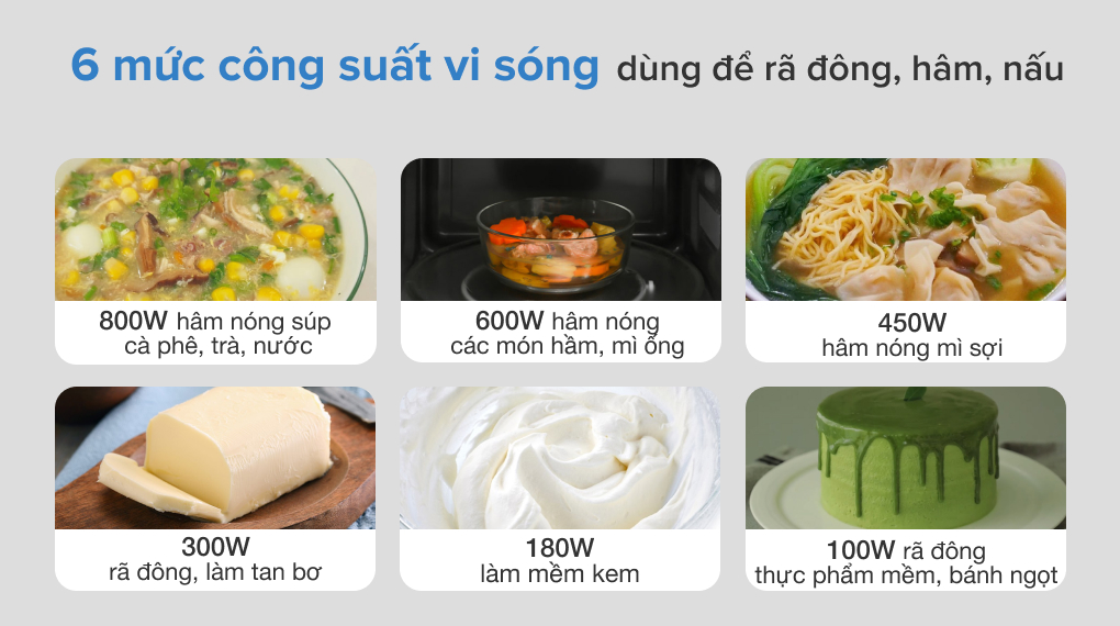 Hâm nóng & rã đông 6 cài đặt mức công suất khác nhau thuận tiện cho việc hâm nóng và rã đông. Hẹn giờ thủ công Dễ dàng kiểm soát thời gian nấu lên đến 30 phút Mức công suất Với 6 chế độ cài đặt, người tiêu dùng có thể dễ dàng lựa chọn mức công suất phù hợp nhất với nhu cầu của mình, từ rã đông đến hâm nóng thực phẩm. Hẹn giờ Dễ dàng kiểm soát khoảng thời gian nấu lên đến 30 phút Đặc điểm kỹ thuật - Dung tích: 20L - Công suất vi sóng: 800W - Đường kính bàn xoay: 24.5cm - Cường độ dòng điện: 13A - Kích thước sản phẩm (HxWxD/mm): 262 x 452 x 365 - Kích thước khoang chứa (HxWxD/mm): 210 x 315 x 329 Tính năng - Phương thức nấu: 2 (Vi sóng, Rã đông) - Mức công suất vi sóng: 6 - Thời gian nấu tối đa: 30min Thiết kế - Loại: Để bàn - Bảng điều khiển: Kiểu số - Cách mở: Bản lề trái