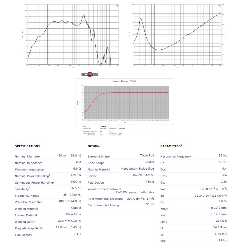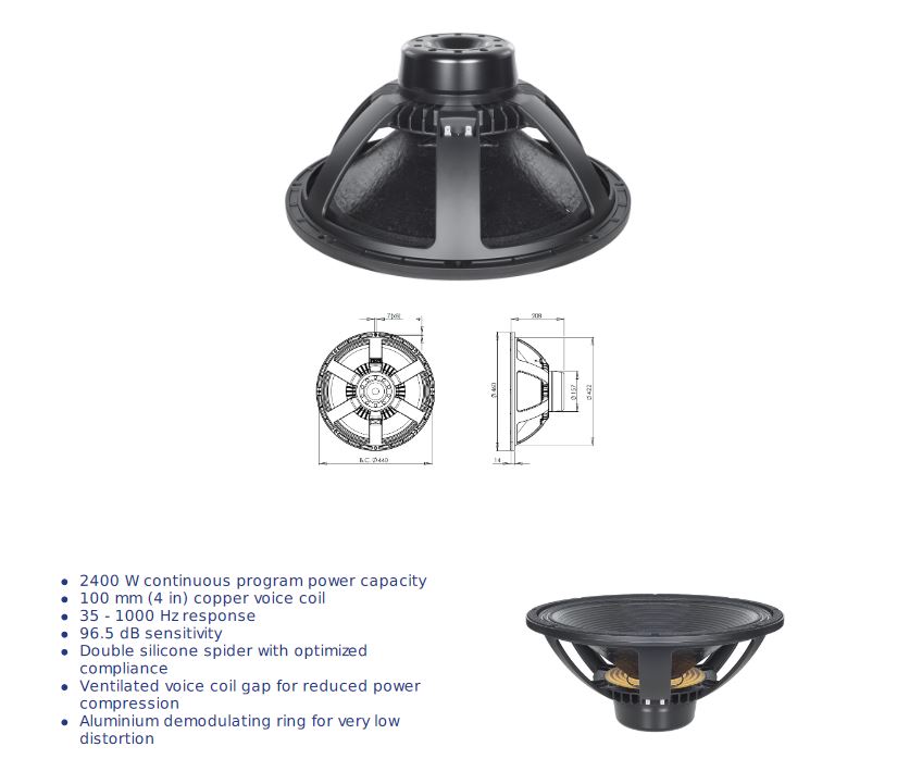 LOA RỜI SUB 5 TẤC B&C Xuất xứ : ITALIA Voice coil bằng đồng khổ lớn 4" (100mm) với chiều cao 25mm Công Suất Program 1200-2400 W Dải tần: 35-1000