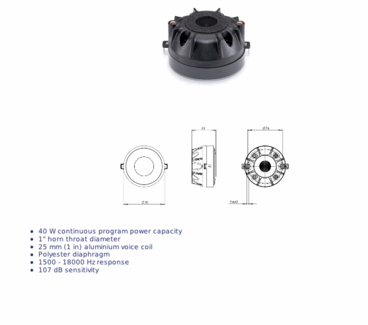 Mua tại TiktokLoa Treble DE10 Thương Hiệu: B&C Xuất xứ: Italia Sử dụng họng 1" Voice coil aluminium 25mm (1") Công suất đỉnh 80 W Công suất 40 w tần số: 1500-18000hz độ nhạy 107 dB Polieste diaphragm.