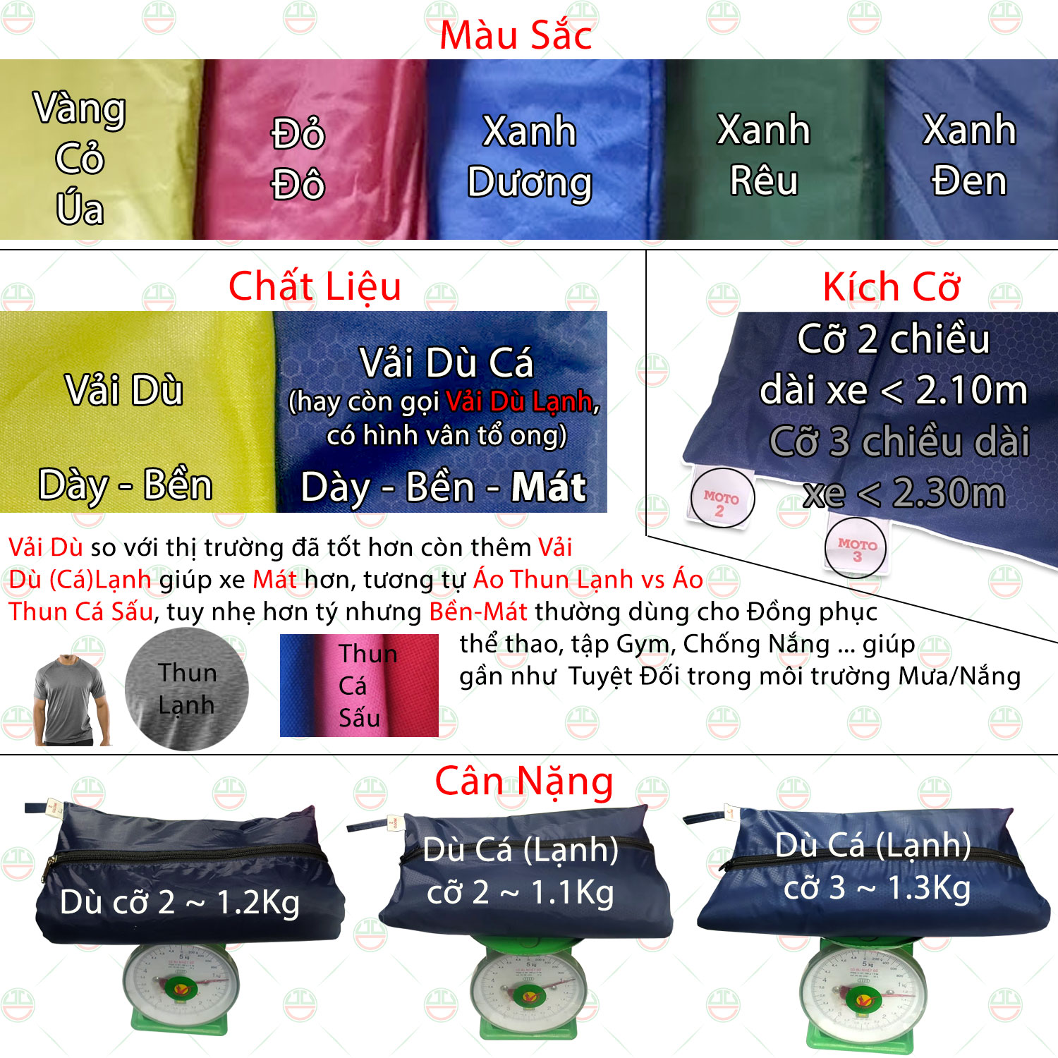 Áo Trùm Bạt Phủ Xe KhoNCC là Sản Phẩm Chất Liệu Vải Dù Xịn (Vải + Nylon chống thấm) , không như một số nơi khác cao cấp lắm là Vải Dù Áo Mưa, che xe trời nắng cực kỳ hại xe (trải nghiệm bằng cách Mặc Áo Mưa Dù trời nắng chưa đầy 5 phút là mồ hôi như tắm huống gì con xe Đi Nóng Máy mới về lại che trời nắng) . Do Mưa/Nắng là 2 trạng thái đối nghịch, được Cái Lọ thì Mất Cái Chai nên chúng tôi nghiên cứu cho ra loại chất liệu Vải Dù Lạnh Dành Cho Xe Máy tốt nhất đáp ứng Cân Đối cho Mưa/Nắng gần như Tuyệt Đối Từ năm 2020 trở đi, các dòng xe tạo sự cạnh tranh đã nâng cấp từ kết cấu (to rộng hơn, tốc độ hơn ) đã ảnh hưởng không ít đến việc sử dụng Áo Trùm Bạt Phủ Xe nếu chỉ nói chung chung dòng xe (vd: SH 125i,150i đời 2019 trở về trước chỉ 2.06m, từ năm 2020 trở đi là 2.09m, cũng như một số dòng Winner X 2021 tuy ngắn nhưng bị ảnh hưởng bởi dè sau, mũi cản biển số ) <---- XEM HÌNH SỐ 2,3, Thông Số Sản Phẩm: