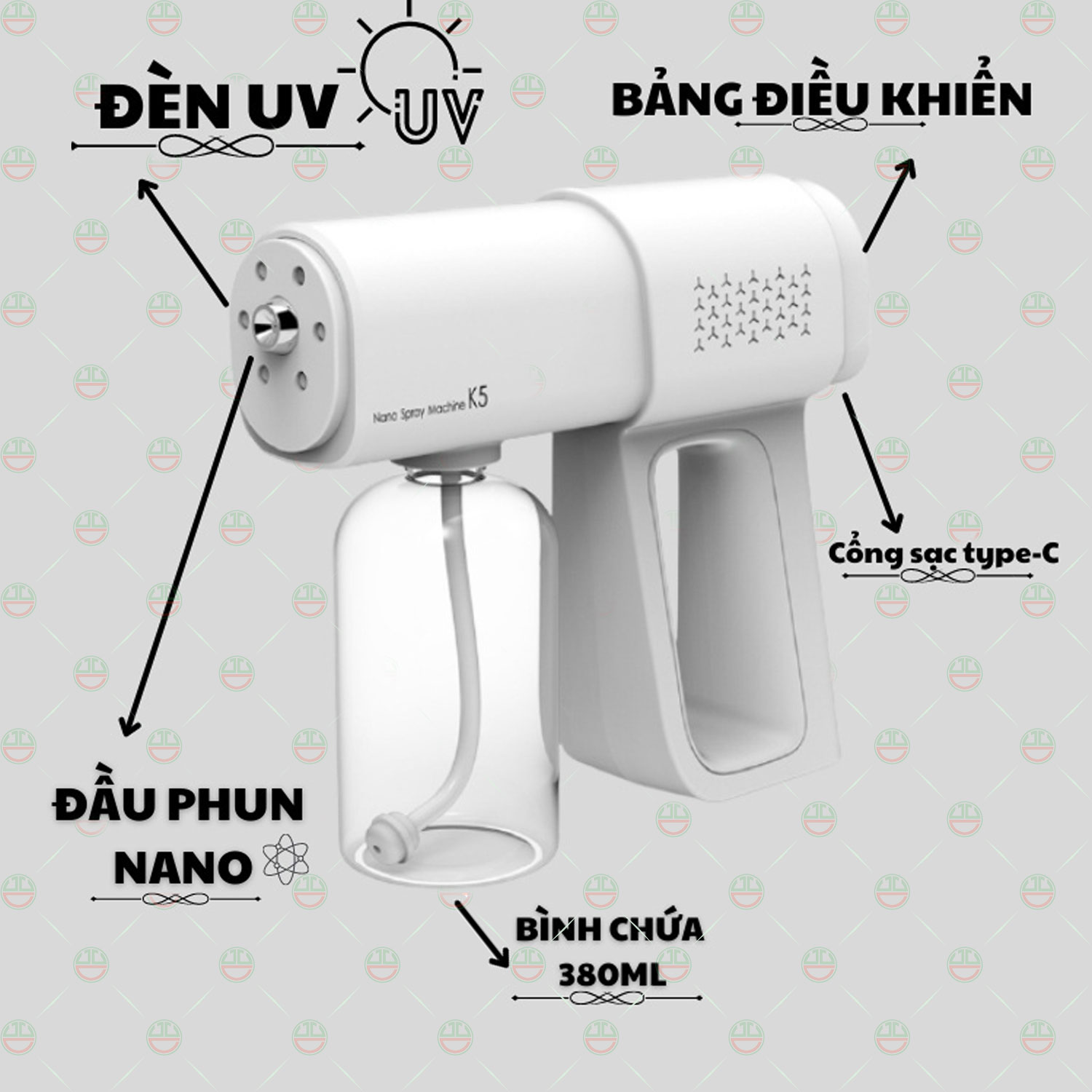 Mua tại TiktokMáy xịt khuẩn - Máy phun sương Nano cầm tay DIỆT vi khuẩn Virus tia UV an toàn cho bé Máy phun sương Nano diệt khuẩn ở nhiệt độ thường, tia nước phun sương cực mịn, không cặn. Sử dụng bộ vi xử lý lõi kép, công nghệ sạc tăng cường độc lập, hiệu suất mạnh mẽ, ổn định lâu dài. Với công nghệ phân tách các phân tử nước thành những hạt nhỏ nano dễ dàng hòa vào không khí giống như sương mù để đưa chất khử khuẩn bám sâu và đều trên bề mặt cần được bảo vệ. Thông Số Sản Phẩm: Tên sản phẩm: Máy tiệt trùng phun tia cực tím