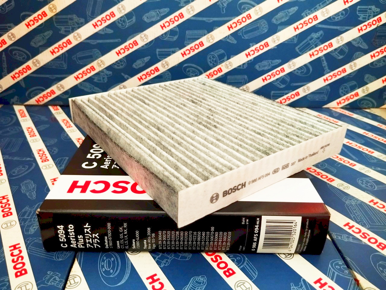 Công nghệ lọc điều hòa than hoạt tính cuả Bosch lọc hiệu quả các loại khuẩn ẩm mốc và các mùi khó chịu như ôzôn, oxit nitơ trong khoang xe • Ưu điểm vượt trội của bộ lọc nhớt Bosch: - Cấu tạo đa tầng, gồm 3 lớp sợivới kích thước sợi khác nhau,có thể hoạt động hiệu quả ở nhiệt độ -40oC đến 85oC - Lớp vi sợi mang cấu trúc tĩnh điện lọc được những phân tử có kích cỡ nhỏ nhất đến 0,0025 mm như phấn hoa hay vi khuẩn - Cấu trúc nếp gấp chắc chắn, giữ bụi rất tốt - Lọc được tới 99% khí độc và mùi khó chịu, bảo vệ hành khách khỏi các chất bụi bẩn trong không khí - Bảo vệ hệ thống điều hòa nhiệt độ, giúp máy điều hòa nhiệt độ hoạt động hết công năng và không gây ra hiện tượng mờ kính - Thân thiện với môi trường nhờ nguyên liệu cấu thành phi kim loại có khả năng phân hủy dễ dàng - Đáp ứng hoàn toàn các tiêu chuẩn về bộ lọc khí của EU, US - Chất lượng chính hãng