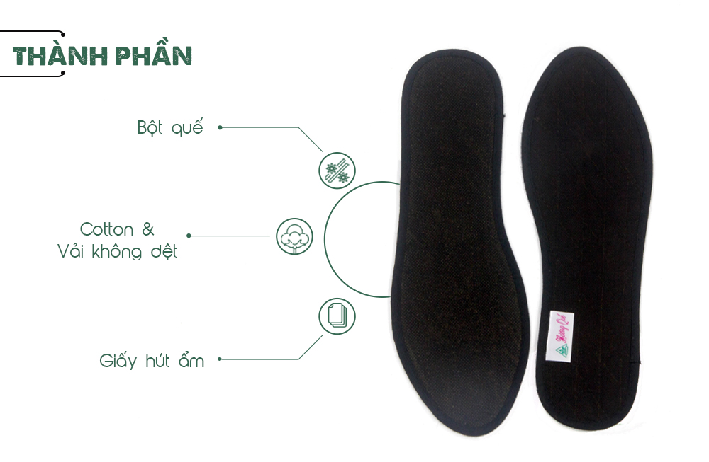 Chất liệu sản phẩm lót giày – Vải 100% cotton – Bột quế tự nhiên nguyên chất 100% – Giấy hút ẩm – Vải không dệt màu đen – Viền xung quanh bằng vải cotton