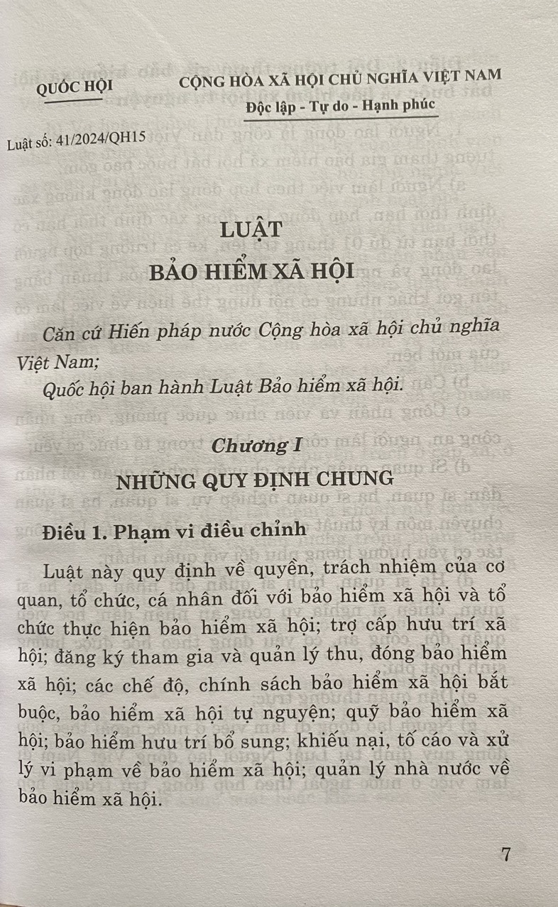 Mua tại TiktokLuật Bảo Hiểm Xã Hội số 41/2024/QH15. Luật có hiệu lực áp dụng từ ngày 01-07-2025 Luật này quy định về quyền, trách nhiệm của cơ quan, tổ chức, cá nhân đối với bảo hiểm xã hội và tổ chức thực hiện bảo hiểm xã hội; trợ cấp hưu trí xã hội; đăng ký tham gia và quản lý thu, đóng bảo hiểm xã hội; các chế độ, chính sách bảo hiểm xã hội bắt buộc, bảo hiểm xã hội tự nguyện; quỹ bảo hiểm xã hội; bảo hiểm hưu trí bổ sung; khiếu nại, tố cáo và xử lý vi phạm về bảo hiểm xã hội; quản lý nhà nước về bảo hiểm xã hội.