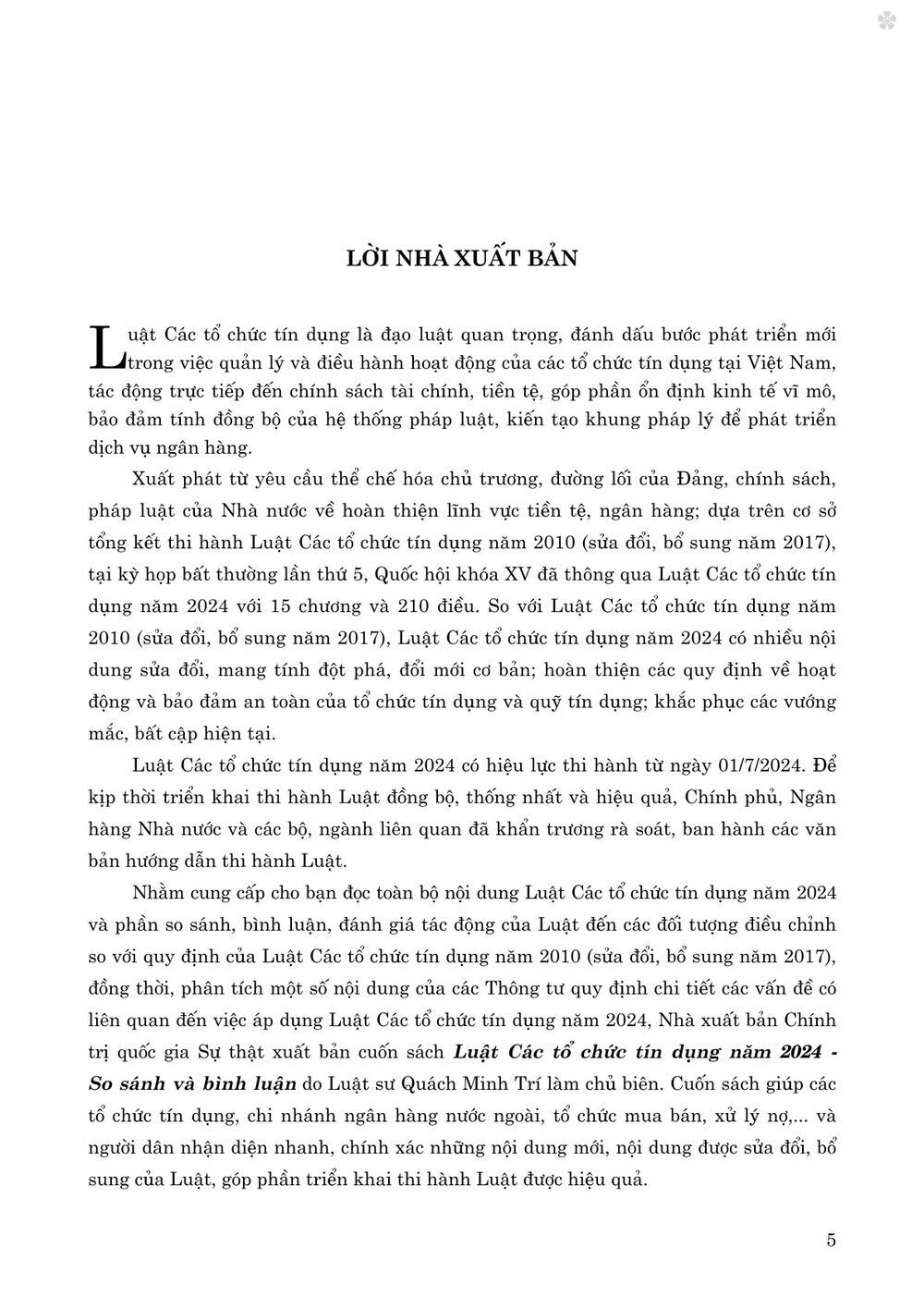 Mua tại TiktokCuốn sách Luật "Các tổ chức tín dụng năm 2024 - So sánh và bình luận" giúp các tổ chức tín dụng, chi nhánh ngân hàng nước ngoài, tổ chức mua bán, xử lý nợ… và người dân nhận diện nhanh, chính xác những nội dung mới, nội dung được sửa đổi, bổ sung của Luật, góp phần triển khai thi hành Luật được hiệu quả.