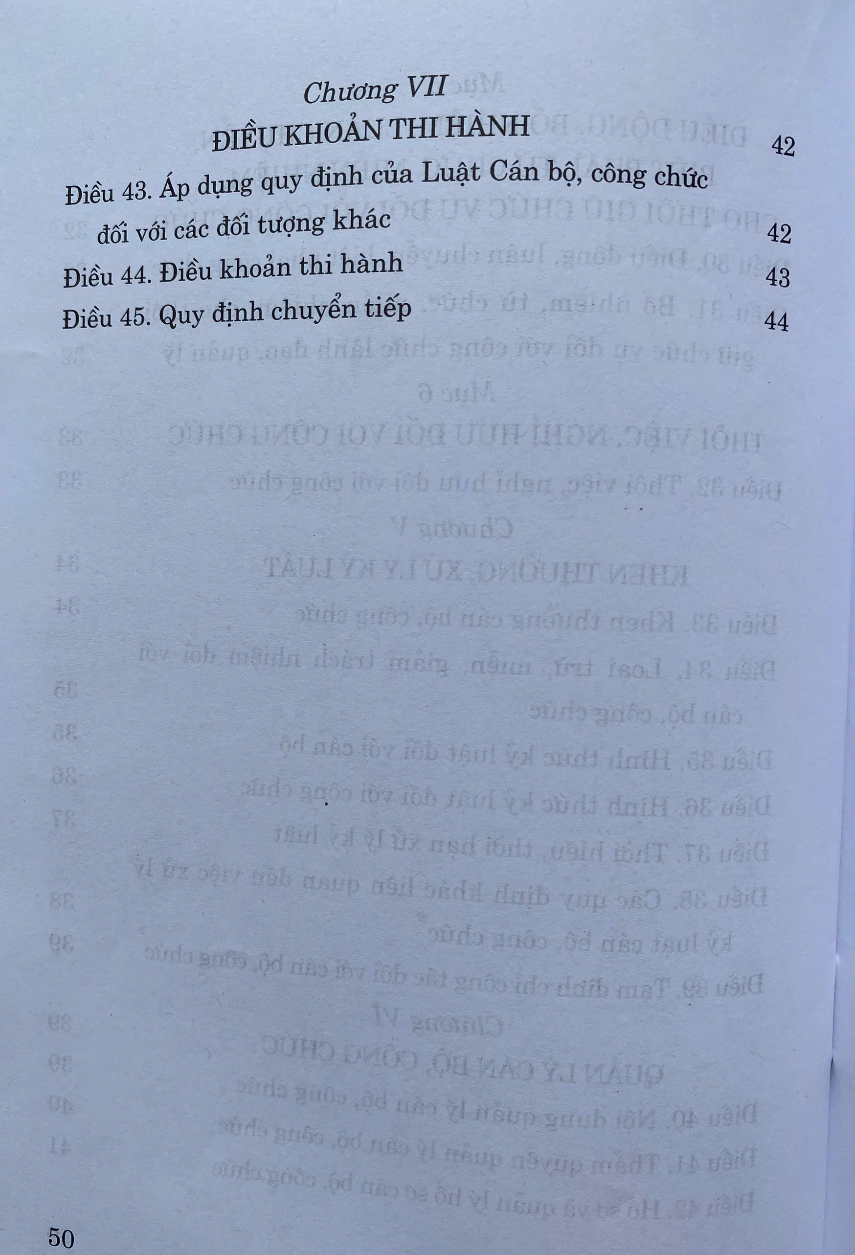Luật Cán Bộ, Công Chức số 80/2025/QH15 đã được Quốc Hội khoá XV, kỳ họp thứ 9 thông qua ngày 24-06-2025 . Luật gồm có 7 Chương, 45 Điều. Luật có hiệu lực áp dụng từ ngày 01-07-2025.