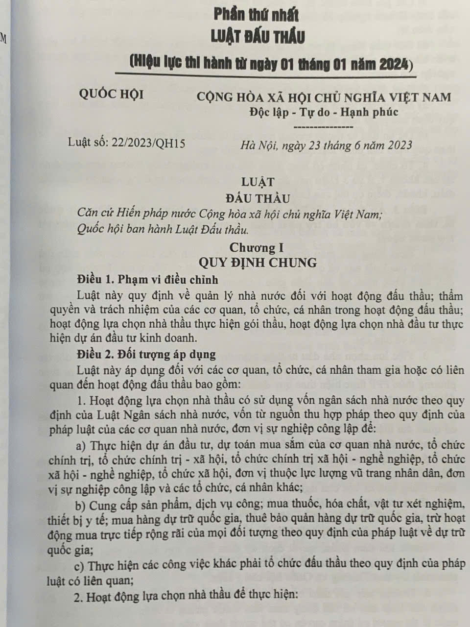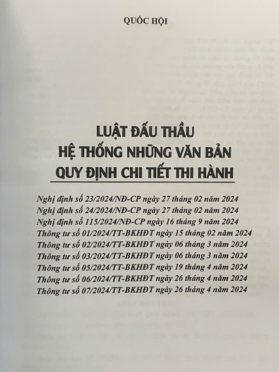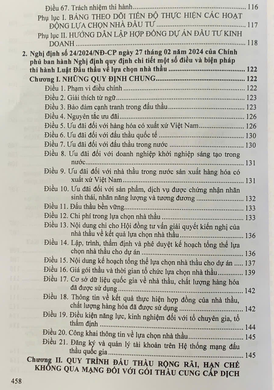 Luật số 22/2023/QH15 được Quốc hội nước Cộng hòa xã hội chủ nghĩa Việt Nam khóa XV, kỳ họp thứ 5 thông qua ngày 23 tháng 6 năm 2023. (sau đây được gọi tắt là Luật Đấu thầu năm 2023) có hiệu lực thi hành từ ngày 01 tháng 01 năm 2024. Nhằm sớm đưa Luật vào cuộc sống, phù hợp với chủ trương của Đảng và Nhà nước, vừa qua Chính phủ và Bộ ngành đã ban hành nhiều văn bản quy định chi tiết thi hành như: Nghị định số 23/2024/NĐ-CP ngày 27 tháng 02 năm 2024 của Chính phủ quy định chi tiết một số điều và biện pháp thi hành Luật Đấu thầu về lựa chọn nhà đầu tư thực hiện dự án thuộc trường hợp phải tổ chức đấu thầu theo quy định của pháp luật quản lý ngành, lĩnh vực; Nghị định số 24/2024/NĐ-CP ngày 27 tháng 02 năm 2024 của Chính phủ ban hành Nghị định quy định chi tiết một số điều và biện pháp thi hành Luật Đấu thầu về lựa chọn nhà thầu; Nghị định số 115/2024/NĐ-CP ngày 16 tháng 9 năm 2024 của Chính phủ quy định chi tiết một số điều và biện pháp thi hành Luật Đấu thầu về lựa chọn nhà đầu tư thực hiện dự án đầu tư có sử dụng đất; Thông tư số 01/2024/TT-BKHĐT ngày 15 tháng 02 năm 2024 của Bộ Kế hoạch và Đầu tư hướng dẫn việc cung cấp, đăng tải thông tin về lựa chọn nhà thầu và mẫu hồ sơ đấu thầu trên Hệ thống mạng đấu thầu quốc gia; Thông tư số 02/2024/TT-BKHĐT ngày 06 tháng 3 năm 2024 của Bộ Kế hoạch và Đầu tư quy định hoạt động đào tạo, bồi dưỡng kiến thức và thi, cấp, thu hồi chứng chỉ nghiệp vụ chuyên môn về đấu thầu; Thông tư số 03/2024/TT-BKHĐT ngày 06 tháng 03 năm 2024 của Bộ Kế hoạch và Đầu tư quy định mẫu hồ sơ lựa chọn nhà đầu tư thực hiện dự án thuộc trường hợp phải tổ chức đấu thầu theo quy định của pháp luật quản lý ngành, lĩnh vực; Thông tư số 05/2024/TT-BKHĐT ngày 19 tháng 4 năm 2024 của Bộ Kế hoạch và Đầu tư quy định về quản lý và sử dụng các chi phí trong lựa chọn nhà thầu, nhà đầu tư trên Hệ thống mạng đấu thầu quốc gia; Thông tư số 06/2024/TT-BKHĐT ngày 26 tháng 4 năm 2024 của Bộ Kế hoạch và Đầu tư hướng dẫn việc cung cấp, đăng tải thông tin về lựa chọn nhà thầu và mẫu hồ sơ đấu thầu trên Hệ thống mạng đấu thầu quốc gia; Thông tư số 07/2024/TT-BKHĐT ngày 26 tháng 4 năm 2024 của Bộ Kế hoạch và Đầu tư quy định chi tiết mẫu hồ sơ yêu cầu, báo cáo đánh giá, báo cáo thẩm định, kiểm tra, báo cáo tình hình thực hiện hoạt động đấu thầu…. Để cung cấp cho bạn đọc những văn bản mới cập nhật, Nhà xuất bản Hồng Đức xuất bản cuốn sách: