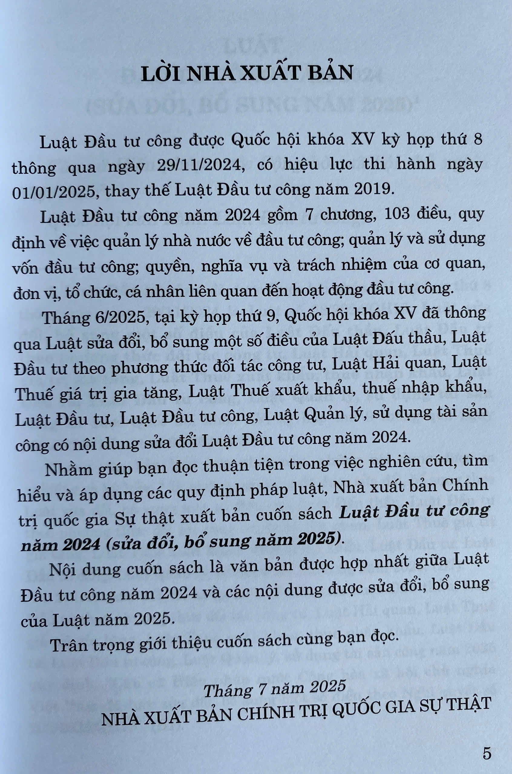 Nhằm giúp bạn đọc thuận tiện trong việc nghiên cứu, tìm hiểu và áp dụng các quy định pháp luật, Nhà xuất bản Chính trị quốc gia Sự thật xuất bản cuốn sách Luật Đầu tư công năm 2024 (sửa đổi, bổ sung năm 2025).