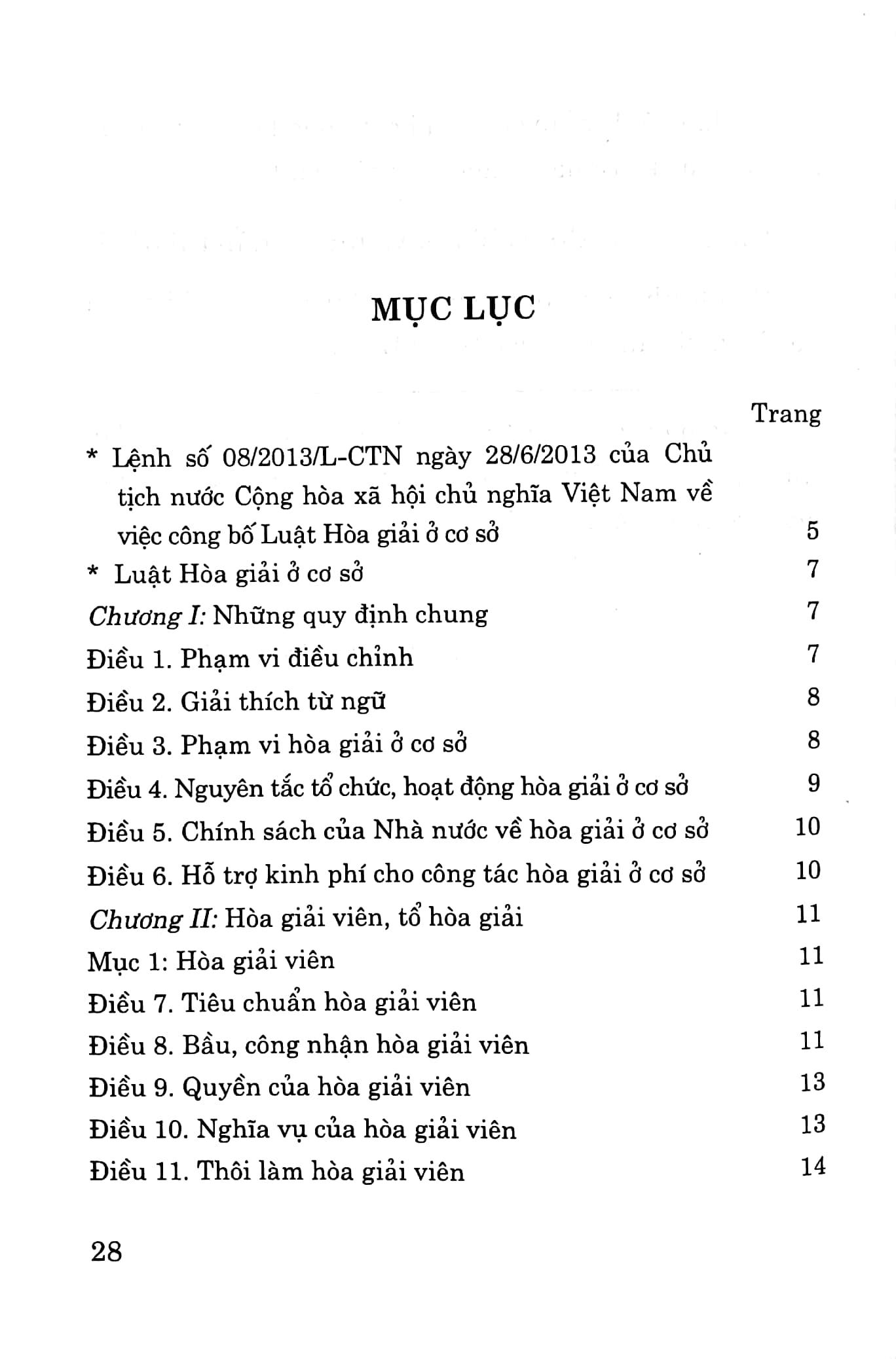 Mua tại TiktokLuật Hòa Giải Ở Cơ Sở (Hiện Hành) Luật Hòa giải ở cơ sở (hiện hành) được Quốc hội nước Cộng hòa xã hội chủ nghĩa Việt Nam khóa XIII, kỳ họp thứ 5 thông qua ngày 20/6/2013, có hiệu lực thi hành từ ngày 01/01/2014. Luật gồm 5 chương, 33 điều, quy định nguyên tắc, chính sách của Nhà nước về hòa giải ở cơ sở, hòa giải viên, tổ hòa giải; hoạt động hòa giải ở cơ sở; trách nhiệm của cơ quan, tổ chức trong hoạt động hòa giải ở cơ sở.