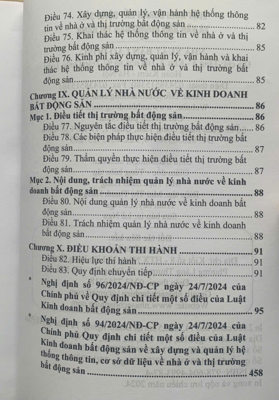 Mua tại TiktokSách Luật Kinh doanh bất động sản và văn bản hướng dẫn thi hành Tác giả: Quốc Hội Nhà xuất bản: Lao Động Công ty phát hành: Dân Hiền Ngày phát hành: 2.2025 Khổ sách: 14,5*20,5cm Số trang: 492 trang Hình thức bìa: bìa mềm Giá bìa: 180.000 đ Nội dung cuốn sách gồm 2 phần Phần 1: Luật Kinh doanh bất động sản Luật số 29/2023/QH15, có hiệu lực từ ngày 01/08/2024. Phần 2: Các nghị định Nghị định số 96/2024/NĐ-CP, ngày 24 tháng 7 năm 2024: QUY ĐỊNH CHI TIẾT MỘT SỐ ĐIỀU CỦA LUẬT KINH DOANH BẤT ĐỘNG SẢN Nghị định số 94/2024/NĐ-CP, ngày 24 tháng 7 năm 2024: QUY ĐỊNH CHI TIẾT MỘT SỐ ĐIỀU CỦA LUẬT KINH DOANH BẤT ĐỘNG SẢN VỀ XÂY DỰNG VÀ QUẢN LÝ HỆ THỐNG THÔNG TIN, CƠ SỞ DỮ LIỆU VỀ NHÀ Ở VÀ THỊ TRƯỜNG BẤT ĐỘNG SẢN