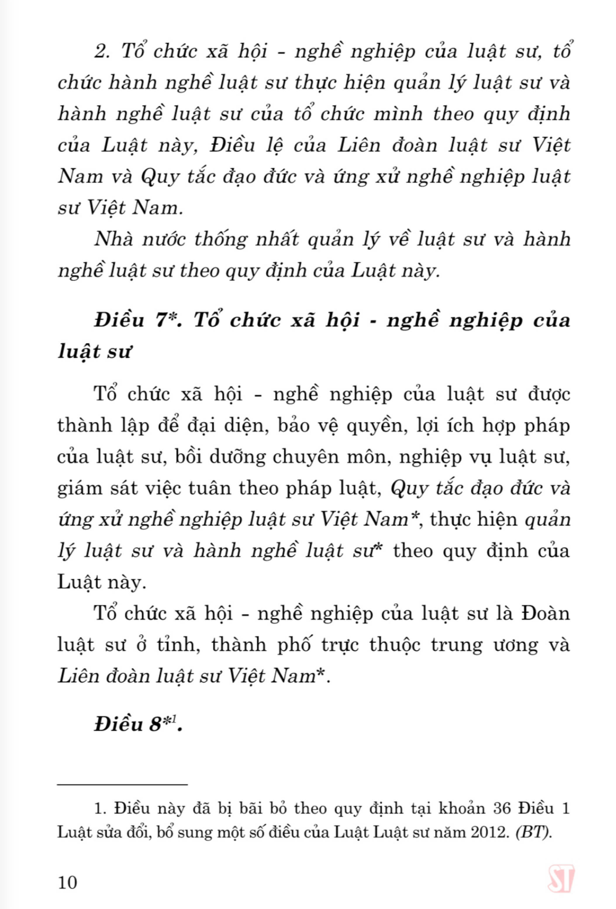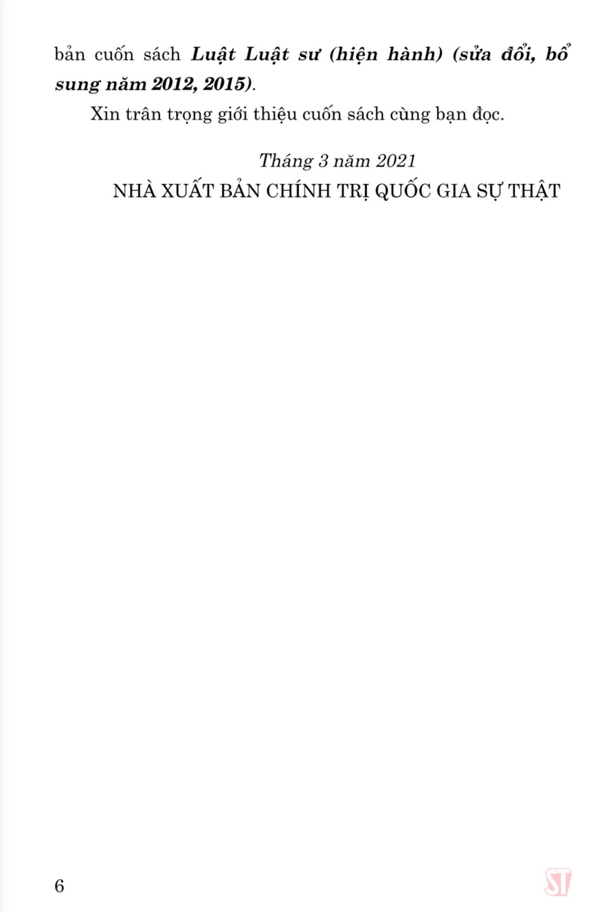 Luật Luật sư năm 2006 được Quốc hội nước Cộng hòa xã hội chủ nghĩa Việt Nam khóa XI, kỳ họp thứ 9 thông qua ngày 29/6/2006. Luật Luật sư quy định về nguyên tắc, điều kiện, phạm vi, hình thức hành nghề, tiêu chuẩn, quyền, nghĩa vụ của luật sư, tổ chức hành nghề luật sư, tổ chức xã hội - nghề nghiệp của luật sư, quản lý hành nghề luật sư, hành nghề của tổ chức hành nghề luật sư nước ngoài, luật sư nước ngoài tại Việt Nam. Để phù hợp với sự phát triển của đời sống kinh tế - xã hội của đất nước, ngày 20/11/2012, Quốc hội nước Cộng hòa xã hội chủ nghĩa Việt Nam khóa XIII, kỳ họp thứ 4 đã thông qua Luật sửa đổi, bổ sung một số điều của Luật Luật sư. Ngày 27/11/2015, Quốc hội khóa XIII, kỳ họp thứ 10 đã thông qua Bộ luật Tố tụng hình sự, trong đó đã tiếp tục sửa đổi Điều 27 của Luật Luật sư. Nhằm cung cấp cho bạn đọc văn bản Luật Luật sư đã được hợp nhất từ Luật Luật sư năm 2006, Luật sửa đổi, bổ sung một số điều của Luật Luật sư năm 2012, Bộ luật Tố tụng hình sự năm 2015 (nội dung liên quan đến sửa đổi Luật Luật sư), Nhà xuất bản Chính trị quốc gia Sự thật tái bản cuốn sách Luật Luật sư (hiện hành) (sửa đổi, bổ sung năm 2012, 2015).