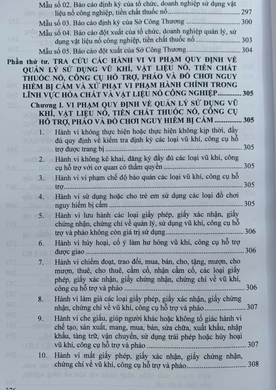 Phần thứ tư. TRA CỨU CÁC HÀNH VI VI PHẠM QUY ĐỊNH VỀ QUẢN LÝ SỬ DỤNG VŨ KHÍ, VẬT LIỆU NỔ, TIỀN CHẤT THUỐC NỔ, CÔNG CỤ HỖ TRỢ, PHÁO VÀ ĐỒ CHƠI NGUY HIỂM BỊ CẤM VÀ XỬ PHẠT VI PHẠM HÀNH CHÍNH TRONG LĨNH VỰC HÓA CHẤT VÀ VẬT LIỆU NỔ CÔNG NGHIỆP