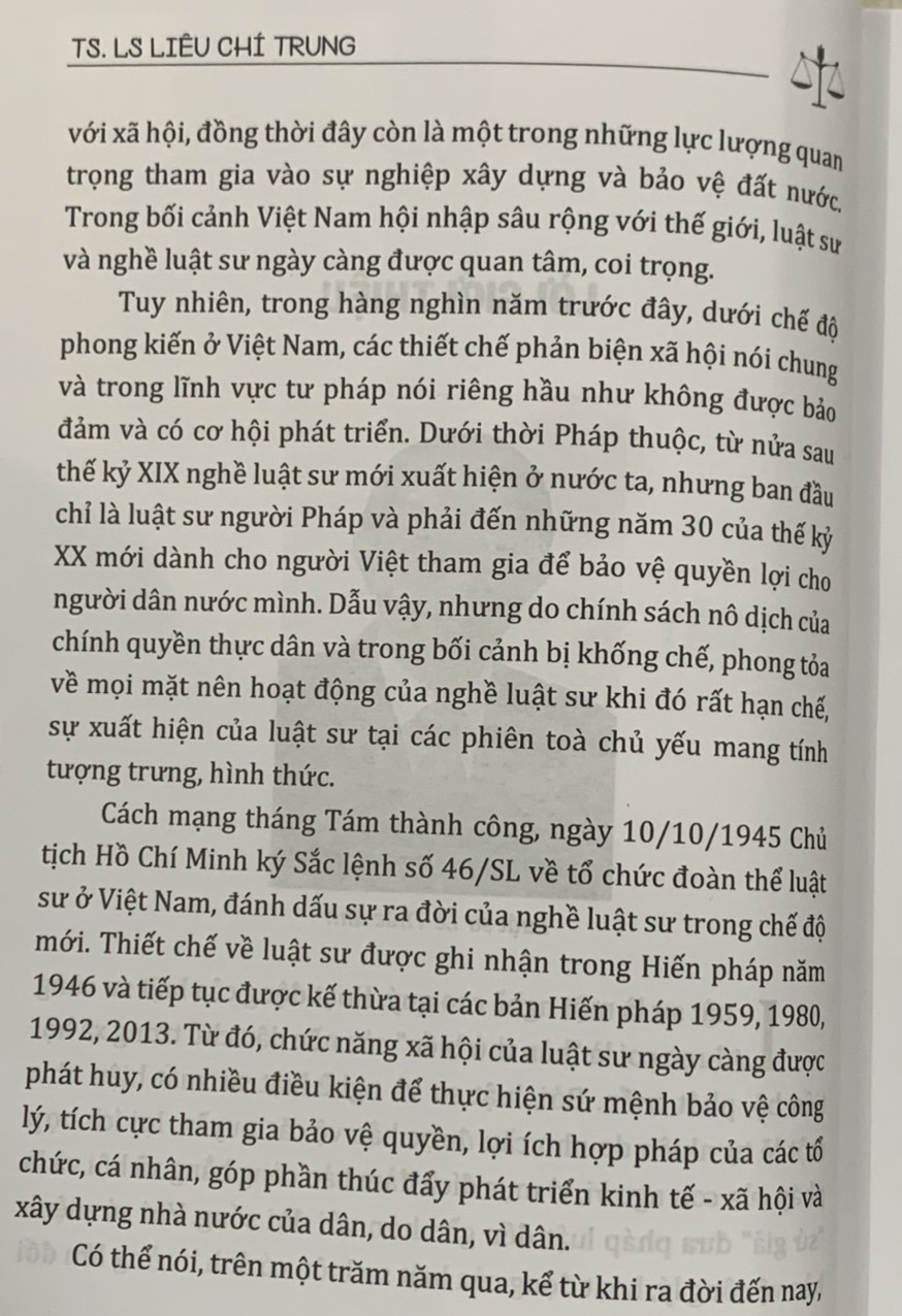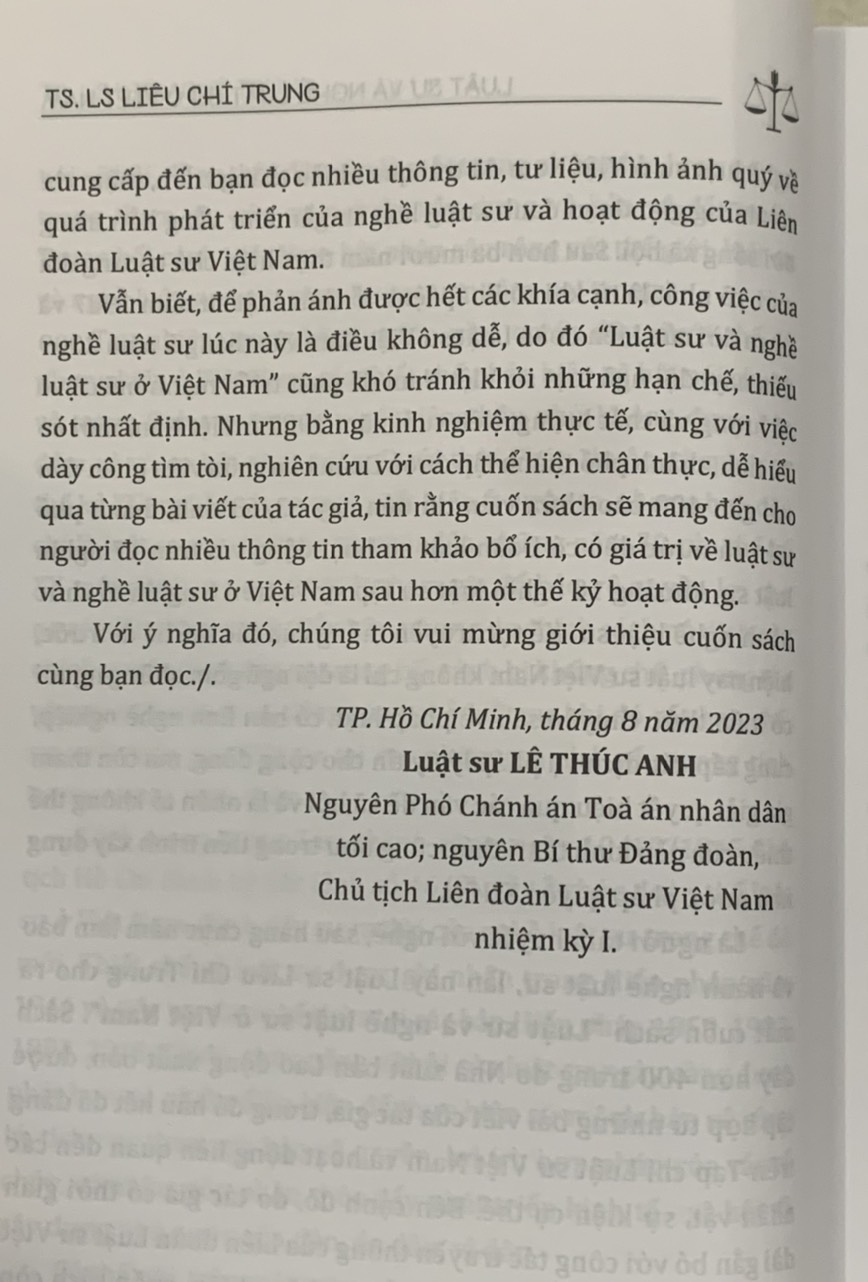 Là người tâm huyết với nghề, sau hàng chục năm làm báo và hành nghề luật sư, lần này Luật sư Liêu Chí Trung cho ra mắt cuốn sách “Luật sư và nghề luật sư ở Việt Nam”. Sách dày hơn 400 trang do Nhà xuất bản Lao động xuất bản, được tập hợp từ những bài viết của tác giả, trong đó hầu hết đã đăng trên Tạp chí Luật sư Việt Nam và hoạt động liên quan đến các nhân vật, sự kiện cụ thể. Bên cạnh đó, do tác giả có thời gian dài gắn bó với công tác truyền thông của Liên đoàn Luật sư Việt Nam và với tình cảm, trách nhiệm nghề nghiệp, cuốn sách còn cung cấp đến bạn đọc nhiều thông tin, tư liệu, hình ảnh quý về quá trình phát triển của nghề luật sư và hoạt động của Liên đoàn Luật sư Việt Nam.