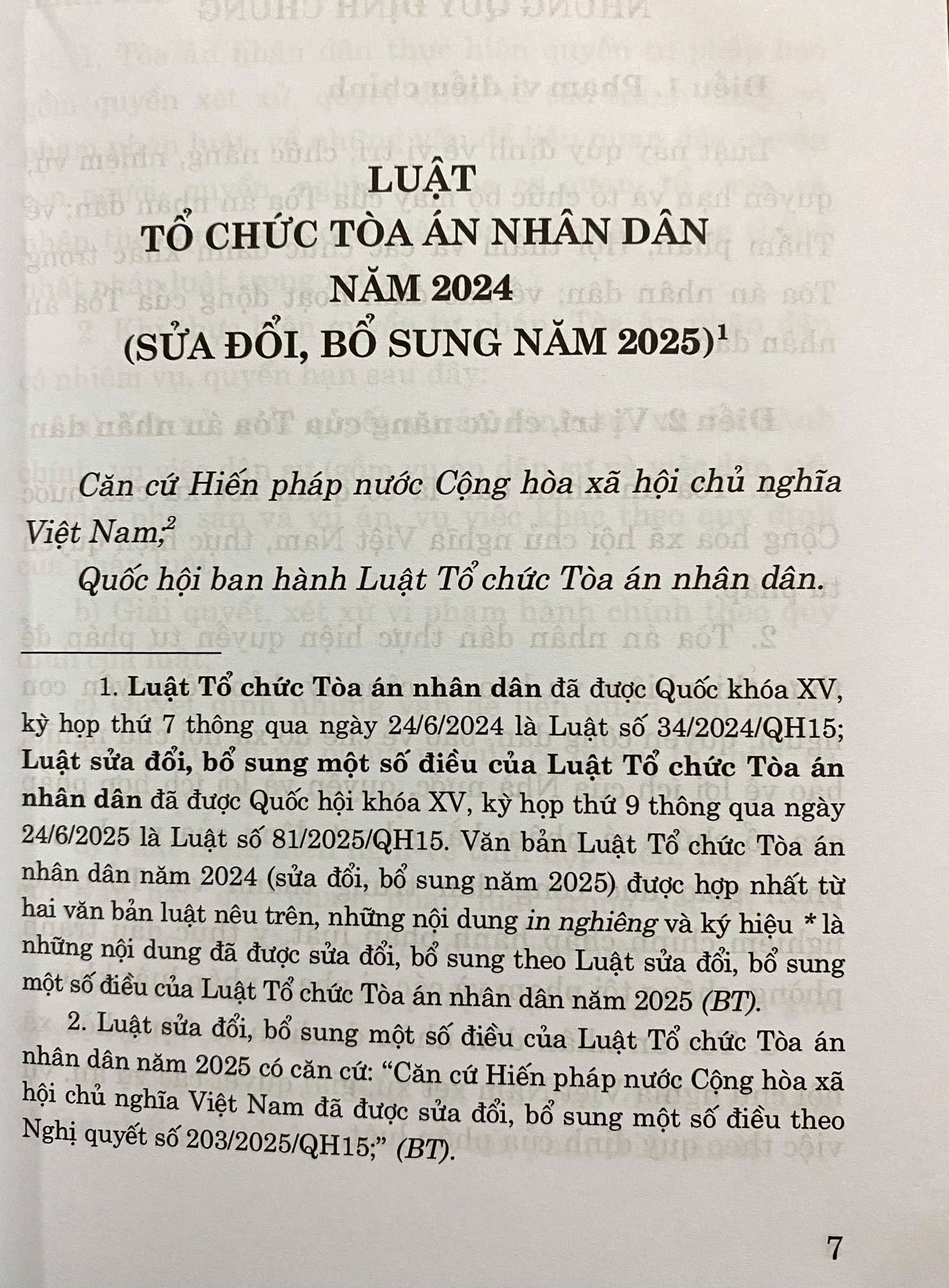 Ngày 24/6/2025, tại kỳ họp thứ 9, Quốc hội khóa XV đã thông qua Luật sửa đổi, bổ sung một số điều của Luật Tổ chức Tòa án nhân dân, có hiệu lực từ ngày 01/7/2025. Luật sửa đổi, bổ sung một số điều của Luật Tổ chức Tòa án nhân dân năm 2025 đã điều chỉnh nhiều nội dung quan trọng so với Luật Tổ chức Tòa án nhân dân năm 2024 nhằm tinh gọn bộ máy, nâng cao hiệu lực và hiệu quả hoạt động của hệ thống Tòa án, đáp ứng yêu cầu cải cách tư pháp trong giai đoạn mới; hướng đến việc hoàn thiện cơ chế tổ chức bộ máy và thẩm quyền của Tòa án các cấp, nâng cao tính minh bạch, trách nhiệm, hiệu quả hoạt động tư pháp và góp phần xây dựng Nhà nước nháp quyền xã hôi chủ nghĩa Việt Nam của Nhân dân, do Nhân dân và vì Nhân dân.