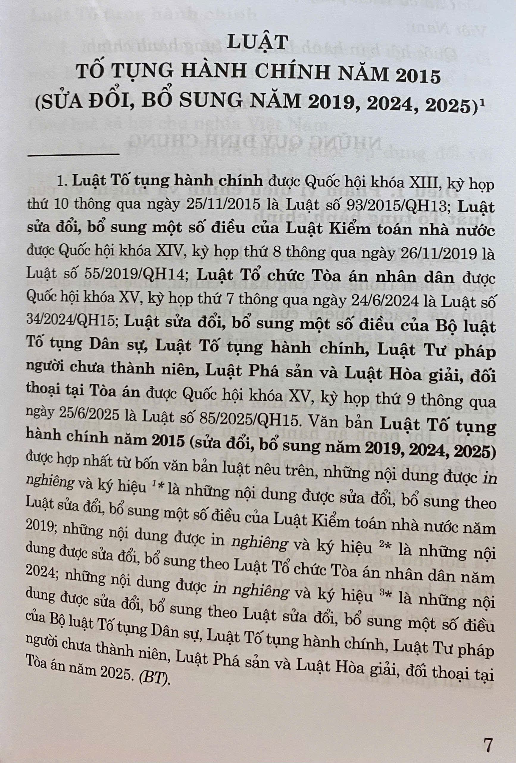Nhằm đáp ứng nhu cầu của bạn đọc trong việc nghiên cứu, tìm hiểu, áp dụng pháp luật một cách thuận tiện, đầy đủ và thống nhất, Nhà xuất bản Chính trị quốc gia Sự thật xuất bản cuốn sách Luật Tố tụng hành chính năm 2015 (sửa đổi, bổ sung năm 2019, 2024, 2025). Nội dung cuốn sách là văn bản hợp nhất của Luật Tố tụng hành chính năm 2015 và các nội dung sửa đổi, bổ sung từ ba văn bản luật nêu trên