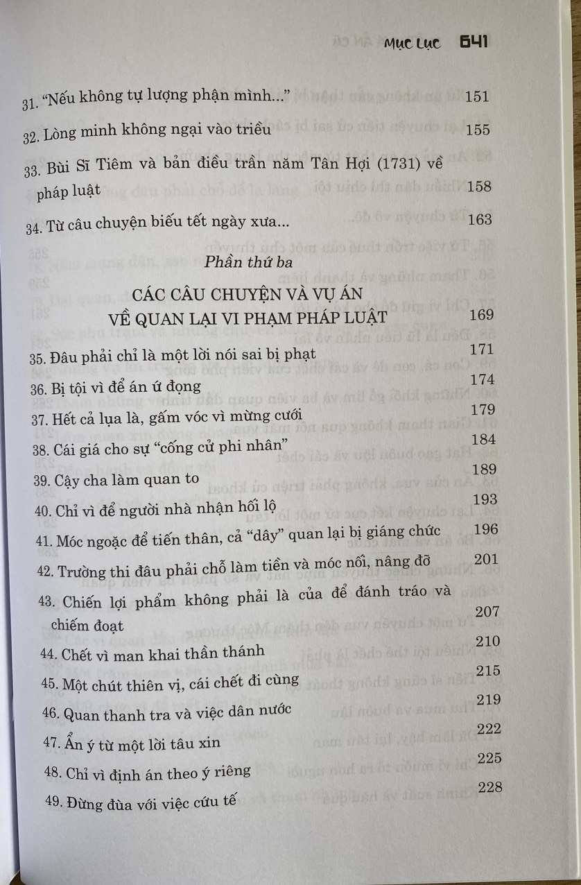 Mua tại TiktokTrong cuốn sách, tác giả đã công phu tập hợp 136 câu chuyện pháp luật thời phong kiến, được ghi lại trong các bộ chính sử của nước nhà; phân tích kỹ các tình tiết của các câu chuyện pháp luật, trong đó nhiều câu chuyện là những vụ án nổi tiếng trong lịch sử phong kiến Việt Nam, với sự có mặt của đủ các giai tầng xã hội từ vua chúa, đội ngũ quan lại các cấp, đến những người dân bình thường; liên quan tới rất nhiều mặt của đời sống xã hội.