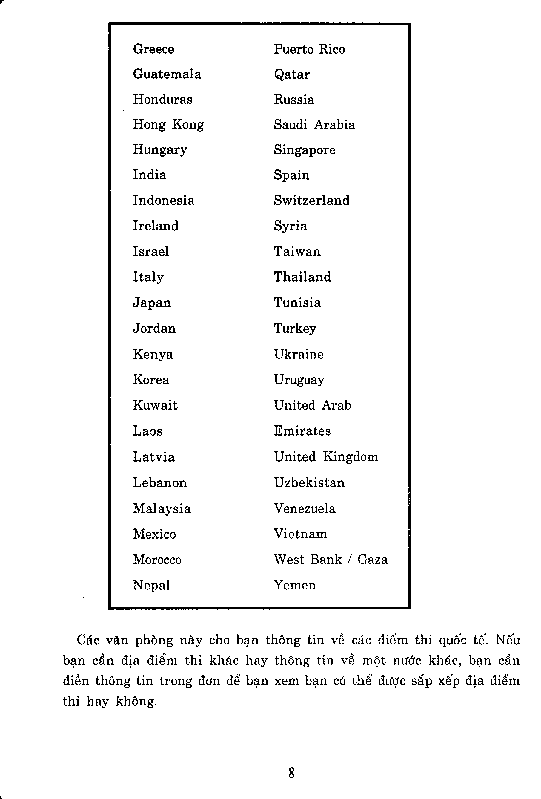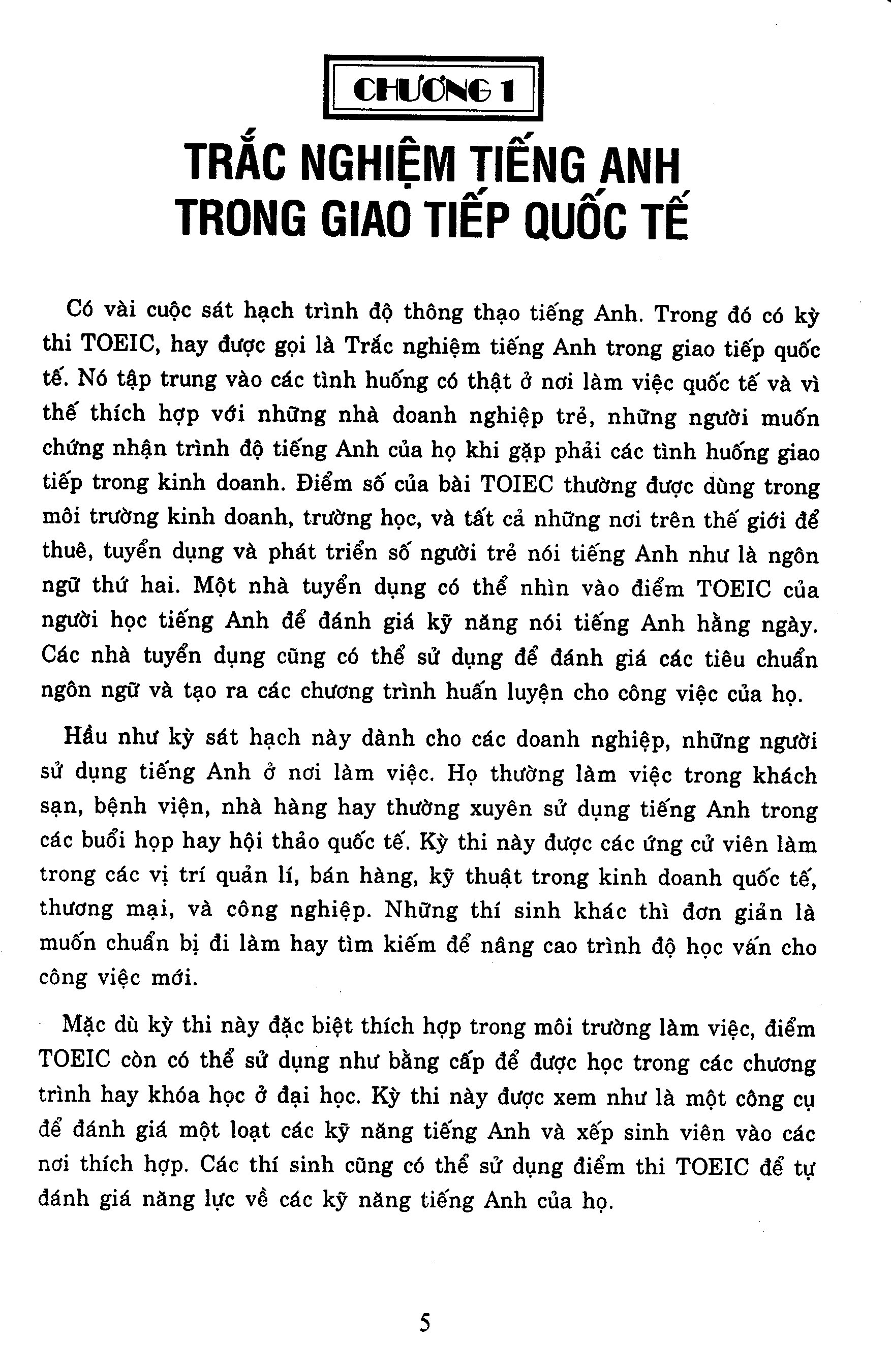 Có vài cuộc sát hạch trình độ thông thạo Tiếng Anh. Trong đó có kỳ thi TOEIC, hay được gọi là trắc nghiệm tiếng Anh trong giao tiếp quốc tế. Nó tập trung vào các tình huống có thật ở nơi làm việc quốc tế và vì thế thích hợp với những nhà doanh nghiệp trẻ, những người muốn chứng nhận trình độ Tiếng Anh của họ khi gặp phải các tình huống giao tiếp trong kinh doanh.