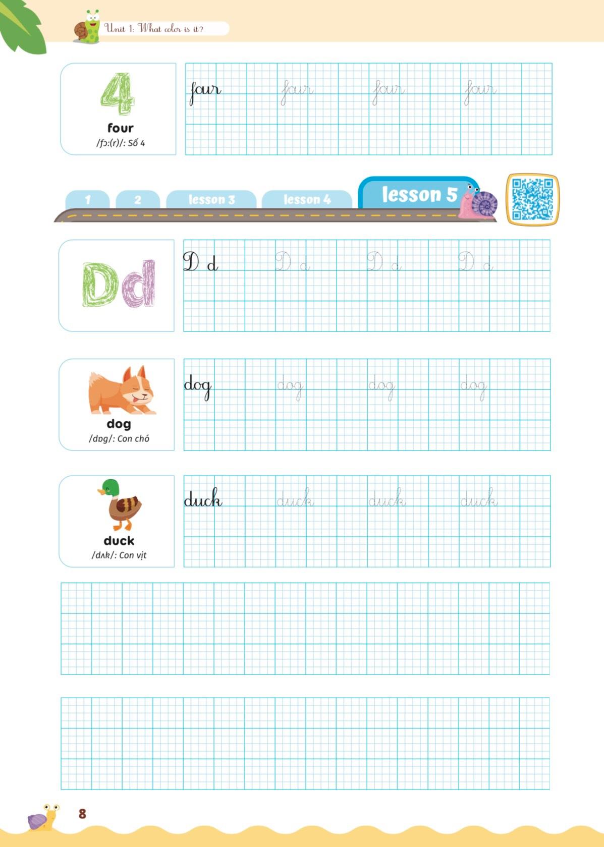 Kèm sau mỗi bài học là những hoạt động thực hành thú vị, các con vừa được ôn lại từ vựng hiệu quả, vừa được thoải mái thư giãn. Phần đáp án chi tiết và trình bày dễ hiểu dễ dàng cho con đối chiếu, đánh giá, tự chấm điểm bản thân, rèn luyện kĩ năng tự học ngay từ bé.