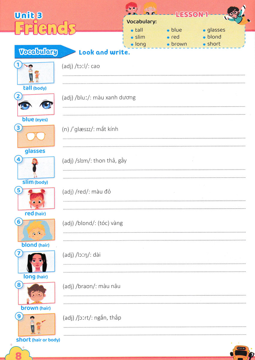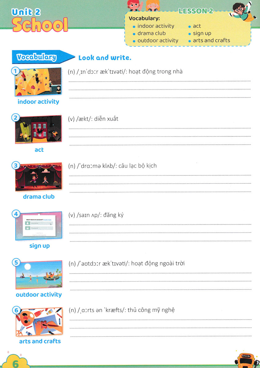 Từ đó, các em có thể sử dụng từ để xây dựng câu trong hoạt động giao tiếp, cũng như giải quyết các bài tập về từ vựng, ngữ pháp… Các em sẽ luyện viết và học từ tiếng Anh bằng các hình ảnh minh họa sinh động. Sau phần luyện từ vựng là các hoạt động chọn từ đúng, điền từ, ghép từ với hình thích hợp, sắp xếp từ, Sau mỗi đơn vị bài học có phần ôn tập (Review) với các hoạt động lý thú giúp các em củng cố kiến thức. Thông qua các hoạt động này các em sẽ cảm thấy hứng thú và tích cực hơn trong quá trình học tập môn Tiếng Anh.