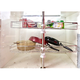 Đặc điểm nổi bật của Mâm xoay toàn phần Inox bóng cao cấp sợi tròn: - Thiết kế 1 trục cố định ở giữa và 2 mâm inox nan có thể xoay. - Được thiết