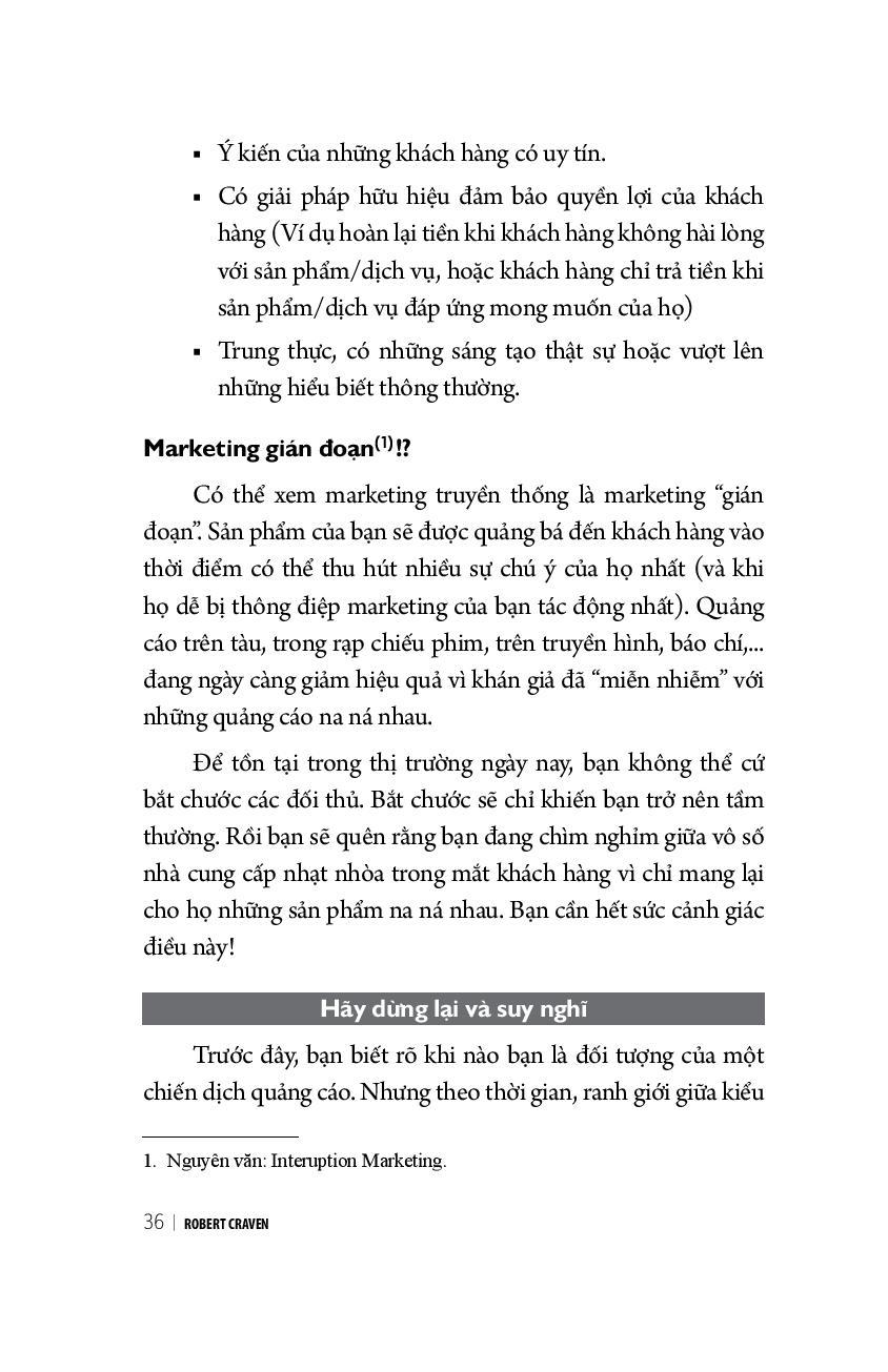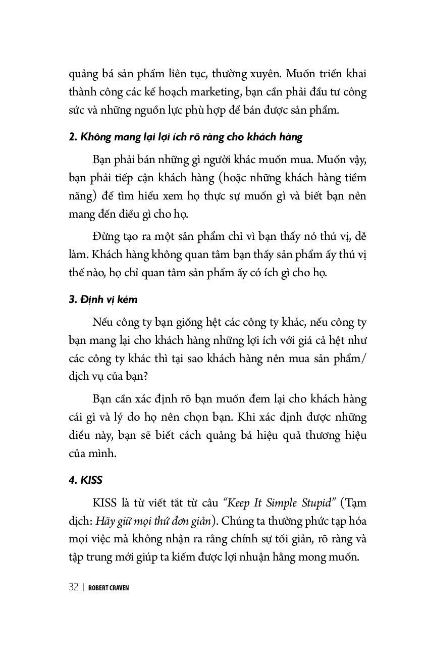 Vì không phải ai cũng có cơ hội tham gia các hội thảo của Robert Craven thế nên Robert Craven viết cuốn sách này để chia sẻ rộng rãi những kiến thức về marketing. Nội dung sách không hề rối rắm, không lý thuyết suông, bao gồm những bước đơn giản, thực tế mà bạn có thể áp dụng để tăng lợi nhuận và doanh số cho công ty.