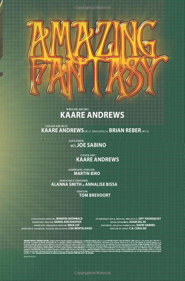 Kaare Andrews (SPIDER-MAN: REIGN) presents an all-new vision of the Marvel Universe! Spy-school Black Widow, teenage Spider-Man, World War II Captain America — the most iconic versions of your favorite Marvel characters from across time and space — all wake up on an island of intrigue, darkness and amazing fantasy. Are they dead? Are they dreaming? Or have they truly been transported to another fantastical realm? And as the heroes explore their uncanny surroundings, can they find a way to return home? This isn’t just a love letter to your favorite Marvel eras, it’s a reinvestment in the seminal characters you’ve always loved, plucked from their quintessential timelines. This is the one you’ve been waiting for, True Believers — an Amazing Fantasy for the ages, featuring Kaare’s unique artwork on the oversized pages of a Treasury Edition!