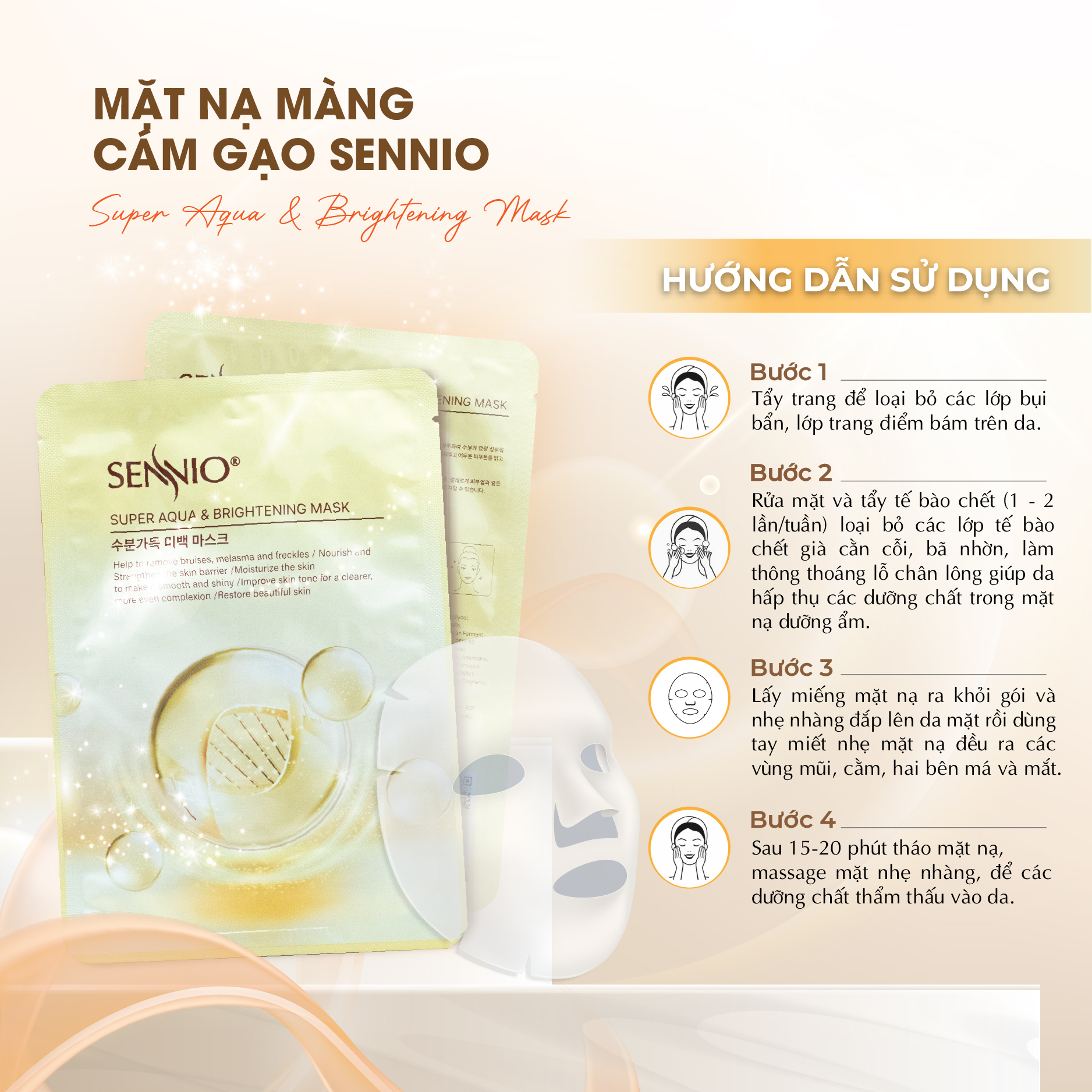 - Tăng cường hệ miễn dịch giúp da khỏe mạnh với sự tác động của môi trường. HƯỚNG DẪN SỬ DỤNG MẶT NẠ CÁM GẠO CẤP ẨM DƯỠNG TRẮNG DA SENNIO: