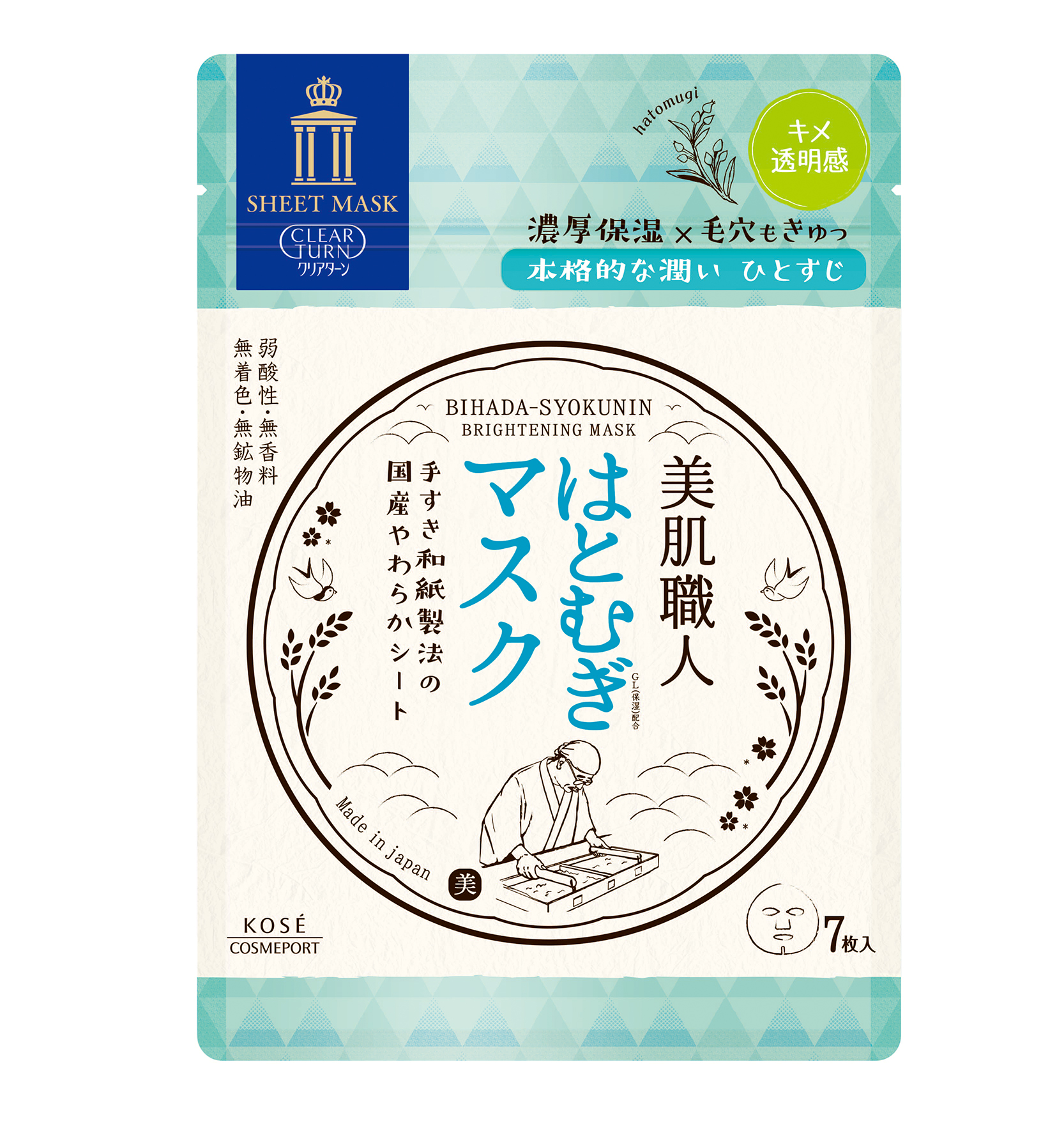 Mặt Nạ Làm Sáng Da Kosé Bihada – Syokunin Clear Turn Brightening Mask B 7 Tấm Xuất xứ : Nhật Bản Quy cách: 7 miếng Miếng mặt nạ được làm từ sợi đặc biệt rất