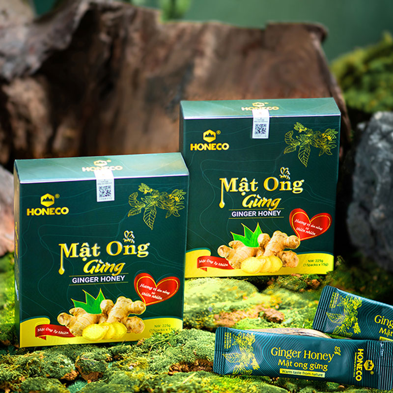 MẬT ONG GỪNG HƯƠNG VỊ ẤM NỒNG TỪ THIÊN NHIÊN Mật ong gừng Honeco được sản xuất trên dây chuyền hiện đại, ứng dụng công nghệ hiện đại vào trong chế biến, giữ nguyên được đặc tính vốn có của mật ong và gừng. Vị cay cay, ấm nồng của tinh chất gừng kết hợp với mật ong ngọt ngào tạo nên một thức uống hoàn hảo. Sản phẩm được Honeco kiểm soát chất lượng và đảm bảo vệ sinh an toàn thực phẩm theo tiêu chuẩn quốc tế FSSC 22000.