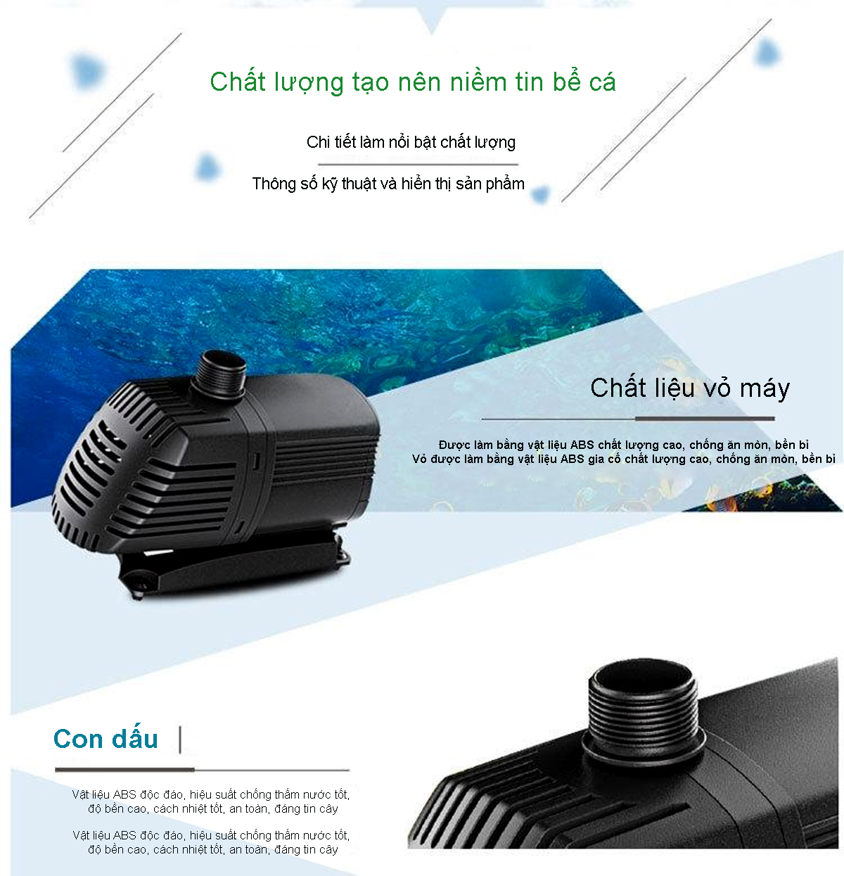 Thiết kế bên ngoài được bao phủ bởi 1 lớp màng chắn tránh hút cá hoặc những phụ kiện nhỏ có trong hồ. Kiểu dáng đa dạng, có thể sử dụng cho hồ cá nước mặn và nước ngọt. Lưu ý khi sử dụng: Thường xuyên kiểm tra máy bơm nếu có hiện tượng bơm yếu, bơm chậm. Nếu gặp tình trạng trên hãy ngắt nguồn điện và tháo phần nắp ngăn lọc ra và vệ sinh lại.