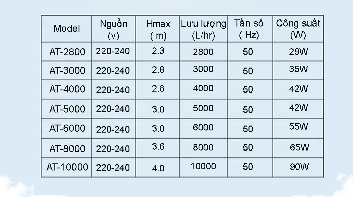 Máy bơm nước ATMAN AT8000 là dòng máy bơm tiết kiệm điện đáng tin cậy và hiệu quả dùng để bơm nước, cấp nước cho các bộ lọc, ao cá, hồ cá, thác nước hoặc đài phun nước.