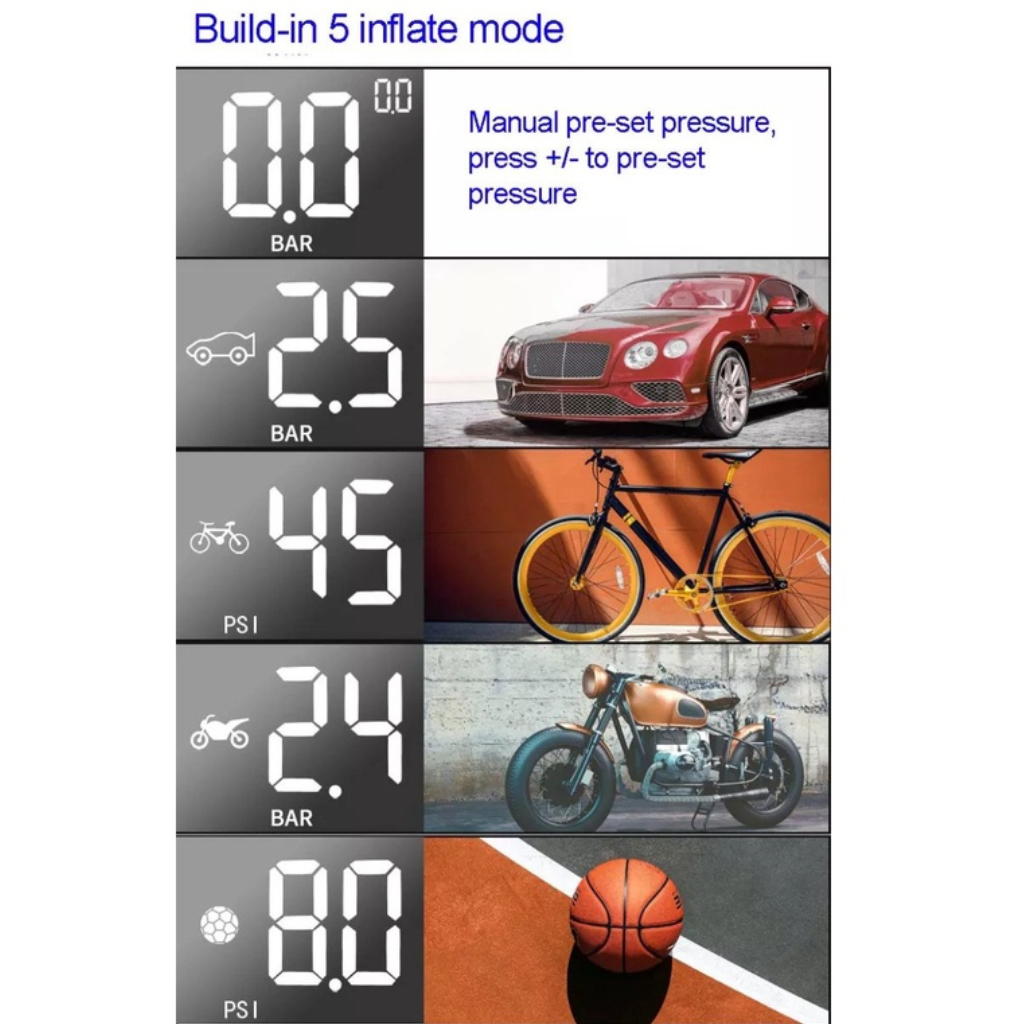 Máy bơm xe hơi ô tô - Đồng hồ điện tử thông minh tự động ngắt - Thiết lập trước áp suất - Tích hợp đèn LED khẩn cấp Những chuyến đi xa, những buổi
