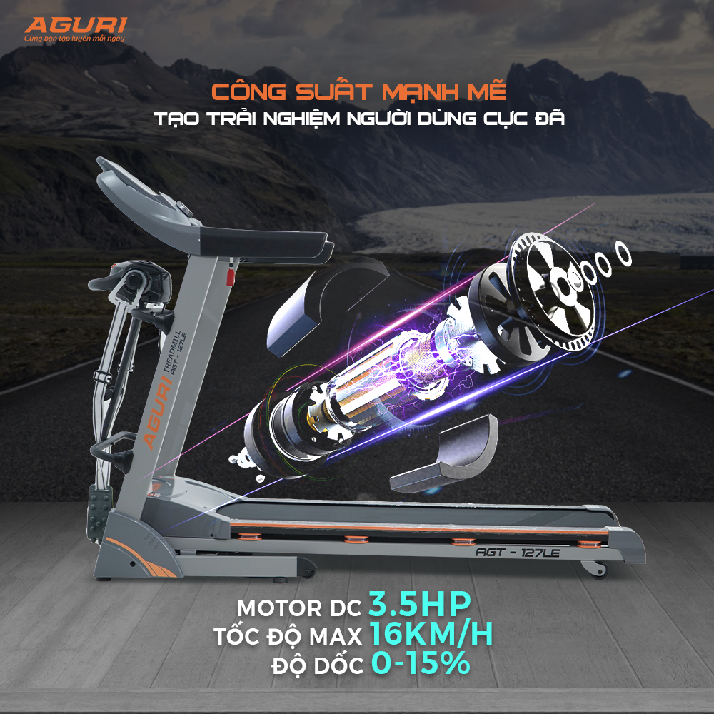 Máy chạy bộ AGURI AGT-127LE - máy chạy bộ tại nhà Đây là máy chạy bộ chính hãng của thương hiệu AGURI - Máy tập của Cầu thủ Công Phượng. Là mẫu máy chạy bộ giá tốt được nhiều người tiêu dùng lựa chọn. Một mẫu máy chạy bộ gấp gọn dễ dàng, tiết kiệm không gian cho người dùng. > THÔNG SỐ KỸ THUẬT: - Motor DC công suất 3.5HP - Tốc độ: 1.0km/h – 16km/h - Chương trình mặc định: P1-P24 - Kích thước đặt máy (dài-rộng-cao): 1760*720*1320mm - Kích thước đóng thùng: 1780*760*325mm - Diện tích băng tải: 450*1350mm - Trọng lượng người dùng tối đa: 130 kgs - N.W/G.W: 80/90kg > MÔ TẢ SẢN PHẨM: - Màn hình LED 5 cửa số hiển thị: thời gian, quãng đường, vận tốc, nhịp tim, calories, chương trình mặc định - Máy có piston thủy lực nâng đỡ, có thể gập gọn máy khi không sử dụng, bàn chạy có tay cầm để dễ dàng nhấc bàn chạy lên - Máy có bánh xe di chuyển rất dễ dàng - Máy được trang bị 1 đầu massage, đánh mỡ bụng ; bộ phận gập bụng - Có hệ thống giảm sóc khi hoạt động, kết nối Bluetooth, hệ thống 2 loa stereo - Có chức năng đo chỉ số cơ thể (Body fat) > CHÍNH SÁCH BẢO HÀNH, BẢO TRÌ: - Bảo hành chi tiết máy lên tới 5 năm. Cụ thể: