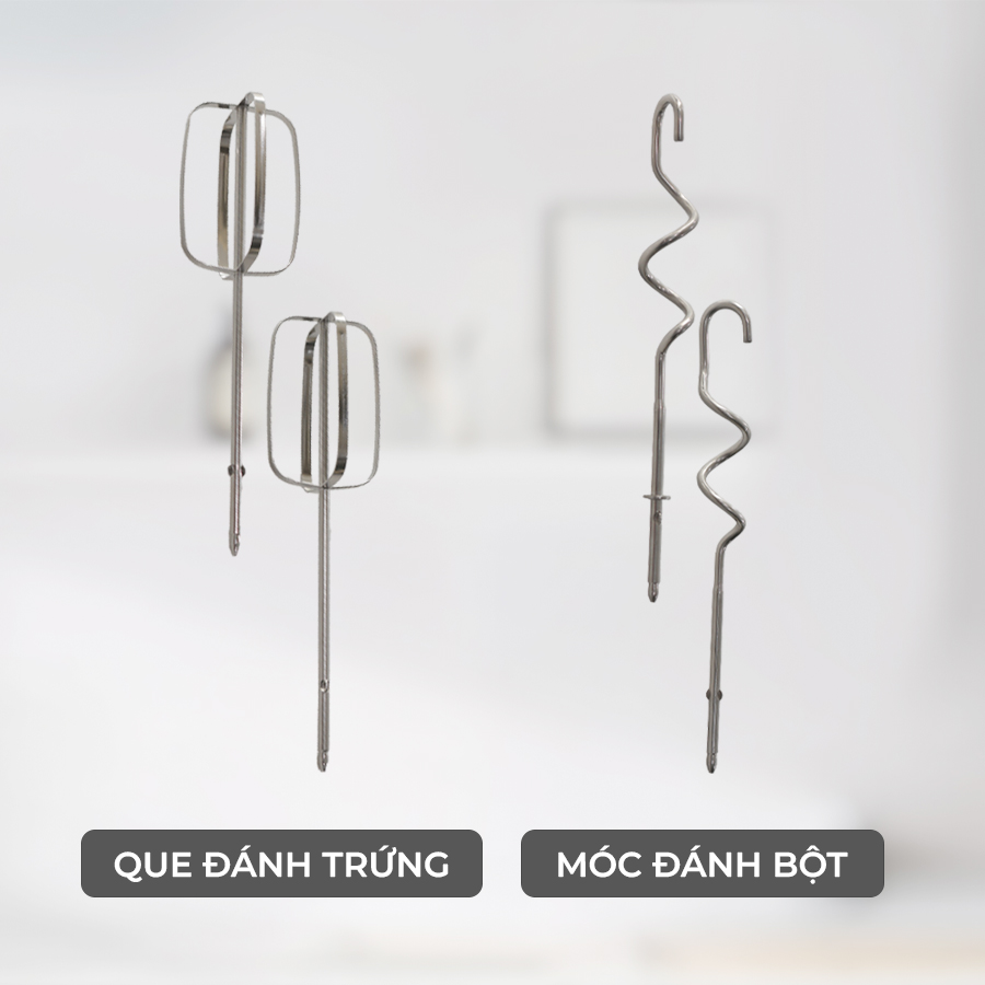 - Tùy thuộc vào mục đích nấu ăn, bạn hãy lắp đặt các phụ kiện phù hợp. Móc đánh bột thích hợp để nhào bột làm bánh, que đánh trứng thích hợp để đánh bông lòng trắng trứng và trộn các loại thực phẩm dạng lỏng như sốt, kem, socola, sốt mayonnaise, v.v. Tay cầm chống trượt - Thiết kế đứng