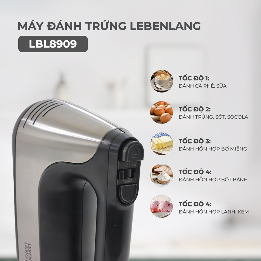 - Bảo hành 2 năm, thương hiệu Đức uy tín trên thị trường. Máy đánh trứng Lebenlang LBL8908, máy trộn cầm tay 5 tốc độ, công suất lớn 400W xứng đáng là trợ lý nấu ăn tuyệt vời, giúp việc làm bếp trở nên dễ dàng và thú vị dành cho cả bố mẹ, con cái cùng gia đình nấu nhiều món ngon hơn và dễ dàng hơn bao giờ hết.