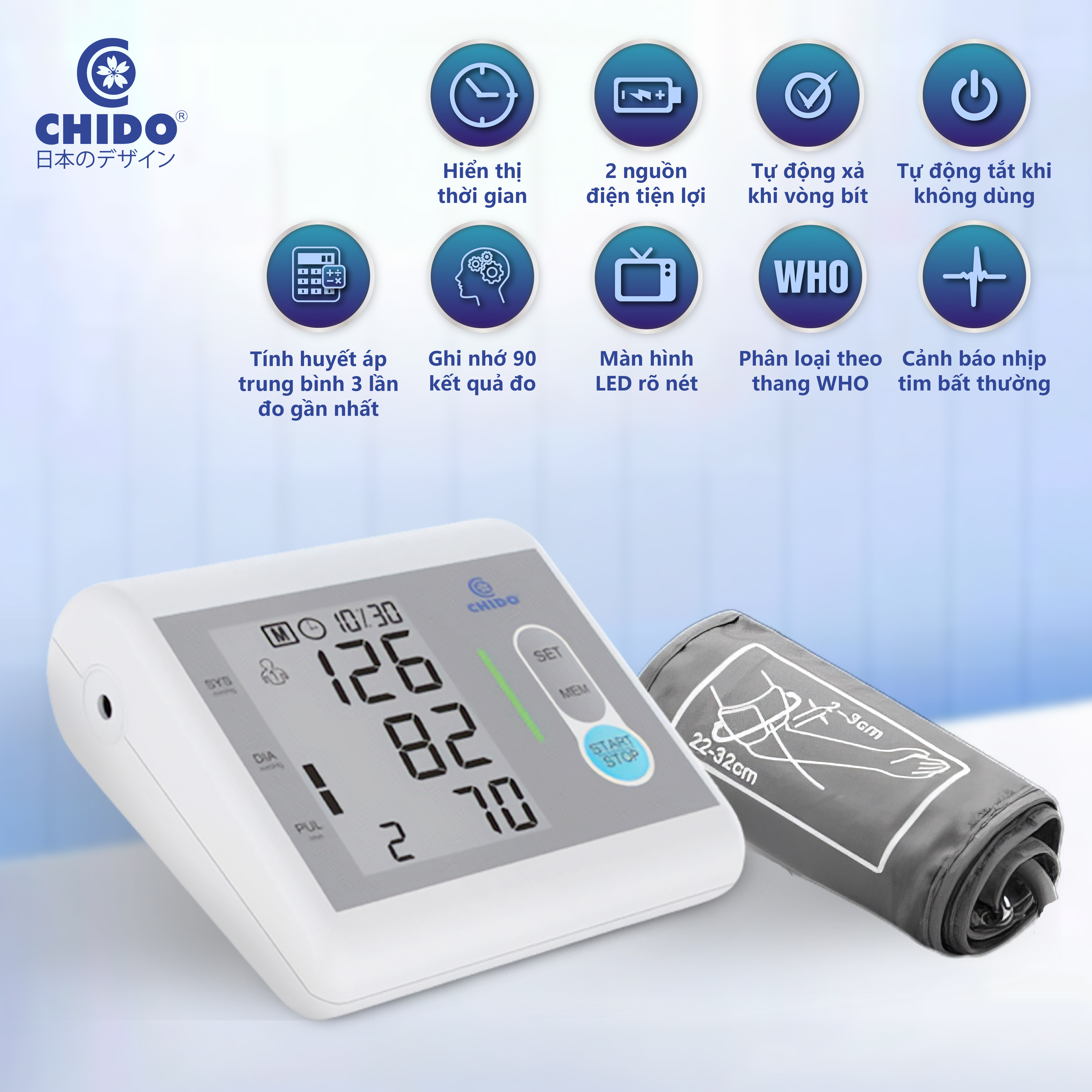 Máy đo huyết áp bắp tay - Chỉ báo mức theo dõi huyết áp theo tiêu chuẩn WHO. - Cảnh báo Phát hiện nhịp tim bất thường. - Bộ nhớ 90 lần x 2 người