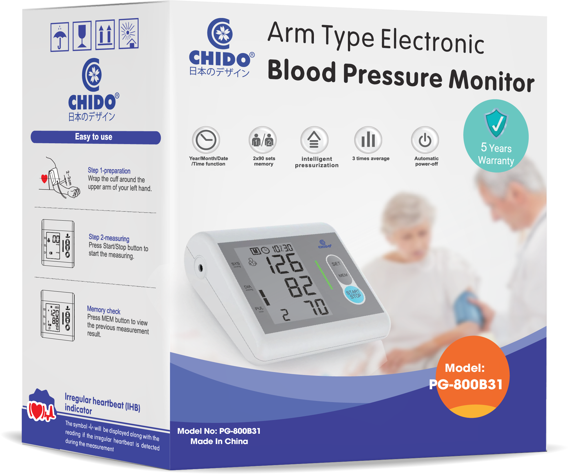 Máy đo huyết áp bắp tay tự động Chido PG-800B31 sử dụng dễ dàng, êm ái khi đo. Máy đo huyết áp bắp tay tự động Chido được trang bị các tính năng cảnh báo những bất thường về nhịp tim hay huyết áp tâm thu, huyết áp tâm trương ở người bệnh. Biểu tượng nhịp tim nhấp nháy nếu huyết áp tâm thu hoặc tâm trương nằm ngoài phạm vi tiêu chuẩn (tâm thu trên 135 mmHg/tâm trương trên 85 mmHg. Bất thường ở nhịp tim không đều được phát hiện khi nhịp tim thay đổi hơn 25% so với nhịp tim trung bình được phát hiện trong quá trình máy đo huyết áp.