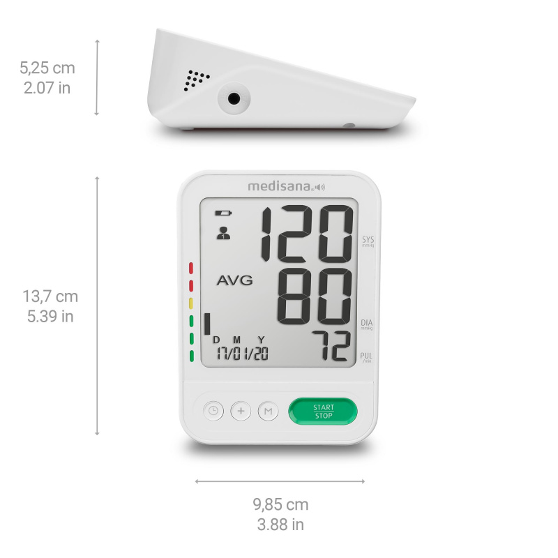 Mua tại TiktokMáy đo huyết áp bắp tay báo kết quả bằng giọng nói • Công nghệ đo IMT (đo trong lúc bơm), kết quả đo chính xác và nhanh chóng, cực kì yên tĩnh • Đọc kết quả bằng giọng nói (Đức, Anh, Hà Lan, Pháp, Italia, Thổ Nhĩ Kỳ) • Bộ nhớ 120 lần đo x 2 người sử dụng • Phân loại mức huyết áp bằng vạch màu theo tiêu chuẩn WHO • Phát hiện chuyển động trong lúc đo, tự động báo lỗi • Báo lỗi khi quấn sai vòng bít • Cảnh báo nhịp tim bất thường • Màn hình LCD hiển thị huyết áp tâm thu, tâm trương, nhịp tim, ngày tháng, thời gian • Đèn nền cùng chữ số lớn (40 mm) dễ đọc • Tự động tắt khi không sử dụng • Kích thước vòng bit lớn 23-43 cm • Thiết bị y tế được chứng nhận MDD (Medical Device Directives - Chỉ thị thiết bị y tế của Ủy ban châu Âu)