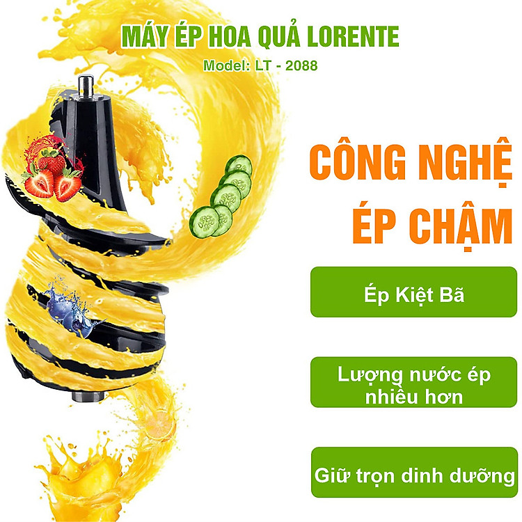 Máy ép chậm Lorente LT - 2088 - Công suất: 300W - Dung tích: 1.0L - Khối lượng: 5.35kg - Kích thước: 360x310x395 mm - Bảo hành: 12 tháng Máy có ống tiếp nguyên liệu