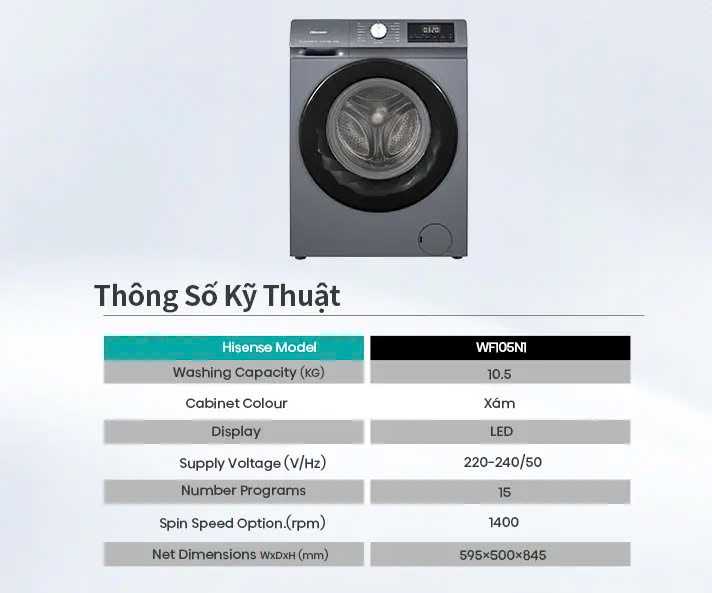 Mua tại TiktokMáy giặt Hisense Inverter WF105N1 với thiết kế hiện đại, khối lượng giặt 10.5 kg phù hợp với gia đình 5-7 thành viên, máy tích hợp đa dạng nhiều chương trình giặt thông minh và nhiều công nghệ giặt hữu ích như Công nghệ giặt hơi nước Allergy Care loại bỏ vi khuẩn và ngăn ngừa các tác nhân gây dị ứng, Pure Jet - Làm sạch mặt trong cửa,... (*) Chương trình giặt Máy giặt Hisense Inverter Pro 10.5 kg WF105N1 15 chương trình giặt: Đồ trẻ em, Vải lụa, Giặt AI, Đồ len, Đồ hỗn hợp, Đồ cotton, Áo sơ mi, Xả + vắt, Vệ sinh lồng giặt, Vắt, Ngâm, Giặt nhanh 15 phút, Giặt ngừa dị ứng, Chăn mền, Chăn lông vũ. (**) Thông số cơ bản Máy giặt Hisense Inverter Pro 10.5 kg WF105N1