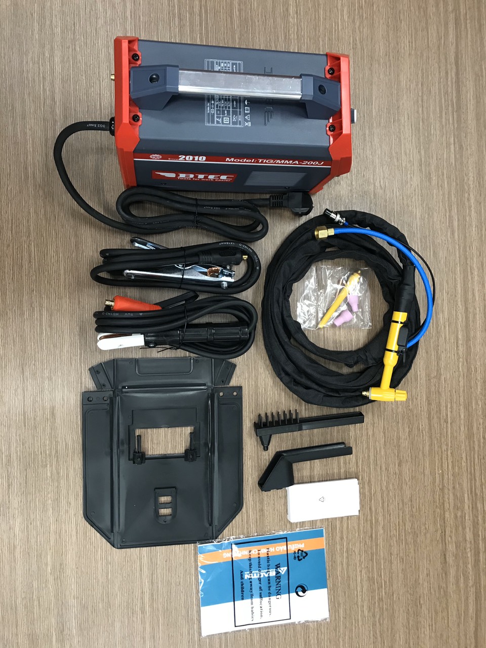 Bộ phụ kiện của máy đi kèm bao gồm: kìm hàn, kẹp mass, búa gõ xỉ, dây hàn tig.