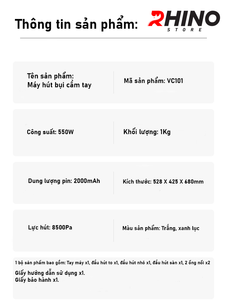 - Mô tả sản phẩm Trong cuộc sống sinh hoạt hàng ngày không thể tránh khỏi các bụi bẩn,rác thải li ti khiến cho nhà cửa trông không được sạch sẽ. Với nhiều dòng máy hút bụi hiện nay khá to và ổn gây nên sự bất tiện. Rhino Store xin gửi các quý khách hàng tham khảo mẫu sản phẩm máy hút bụi cầm tay với sự tiện lợi có thể dùng ở các không gian khác nhau như phòng khách, phòng ngủ, ô tô,