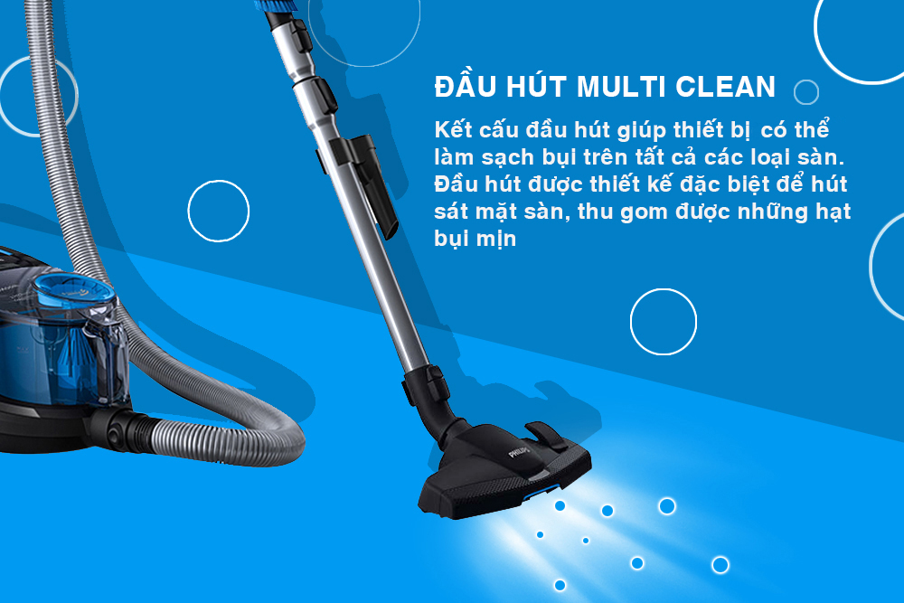 Thiết kế tiện dụng, sang trọng Máy Hút Bụi Philips FC9350 (1800W) với thân máy mang màu đen, kiểu dáng nhỏ gọn sẽ giúp cho không gian căn bếp nhà bạn thêm sang trọng, hiện đại. Thết bị có thể được cuộn tròn lại để cất gọn gàng khi không sử dụng, tiết kiệm tối đa không gian phòng. Sản phẩm mang kiểu dáng của máy hút bụi truyền thống nhưng nhỏ gọn hơn. Ống thu gọn 2 phần bằng kim loại, có thể hoạt động trong bán kính 9m. Đồng thời, được trang bị 2 bánh xe cao su lớn để thuận tiện cho việc di chuyển khắp nơi trong căn nhà. Đầu hút Multi Clean Kết cấu đầu hút giúp thiết bị có thể làm sạch bụi trên tất cả các loại sàn. Đầu hút được thiết kế đặc biệt để hút sát mặt sàn, thu gom được những hạt bụi mịn. Đặc biệt hơn, bàn chải bụi được tích hợp vào tay cầm để bạn dễ dàng chuyển đổi và sử dụng trên từng bề mặt khác nhau. Hoạt động mạnh mẽ với công suất cao Máy vận hành với công suất 1800W, cho lực hút lên đến 37L/s, cho hiệu suất làm sạch bụi cao, tiết kiệm thời gian và công suất dọn dẹp nhà cửa của bạn. Các mức công suất có thể được điều chỉnh nhờ vào một phía bấm +, - để bạn tùy chỉnh phù hợp với nhu cầu khác nhau. Bộ lọc EPA10 Thiết bị sử dụng bộ lọc khí có nấp gếp cho hiệu suất lọc đạt 99.95% với những hạt bụi nhỏ, phấn hoa, lông thú nuôi và các mạt bụ mà không bị tắc nghẽn, mang lại cho bạn không khí sạch sẽ, giảm thiểu tối đa các tác nhân gây dị ứng. Bộ lọc có thể rửa được vĩnh viễn. Thiết kế khí động lực PowerCyclone 5 Công nghệ PowerCyclone 5 giúp tăng tốc không khí trong khoang lốc xoáy để phân tách bụi và đảm bảo hiệu suất làm sạch thông qua các bước hiệu quả cao: