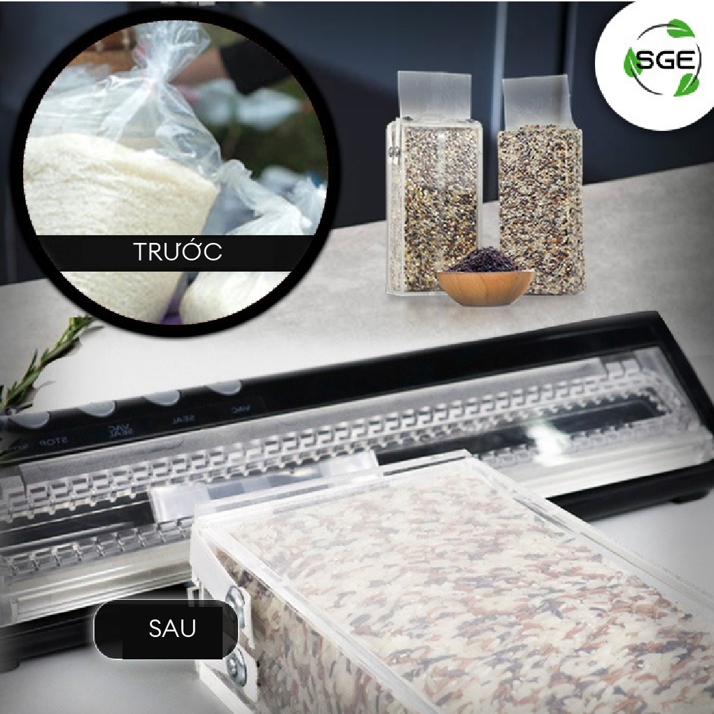 - Máy hút chân không gia đình VCX là máy hút chân không giá rẻ nhất có thể hút chân không túi đựng gạo với sản phẩm sau khi đóng gói vuông vắn, bắt mắt