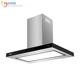 Máy hút mùi đảo hình chữ T sang trọng độc đáo. Màu sắc inox sáng, vành màu đen sang trọng và nổi bật.