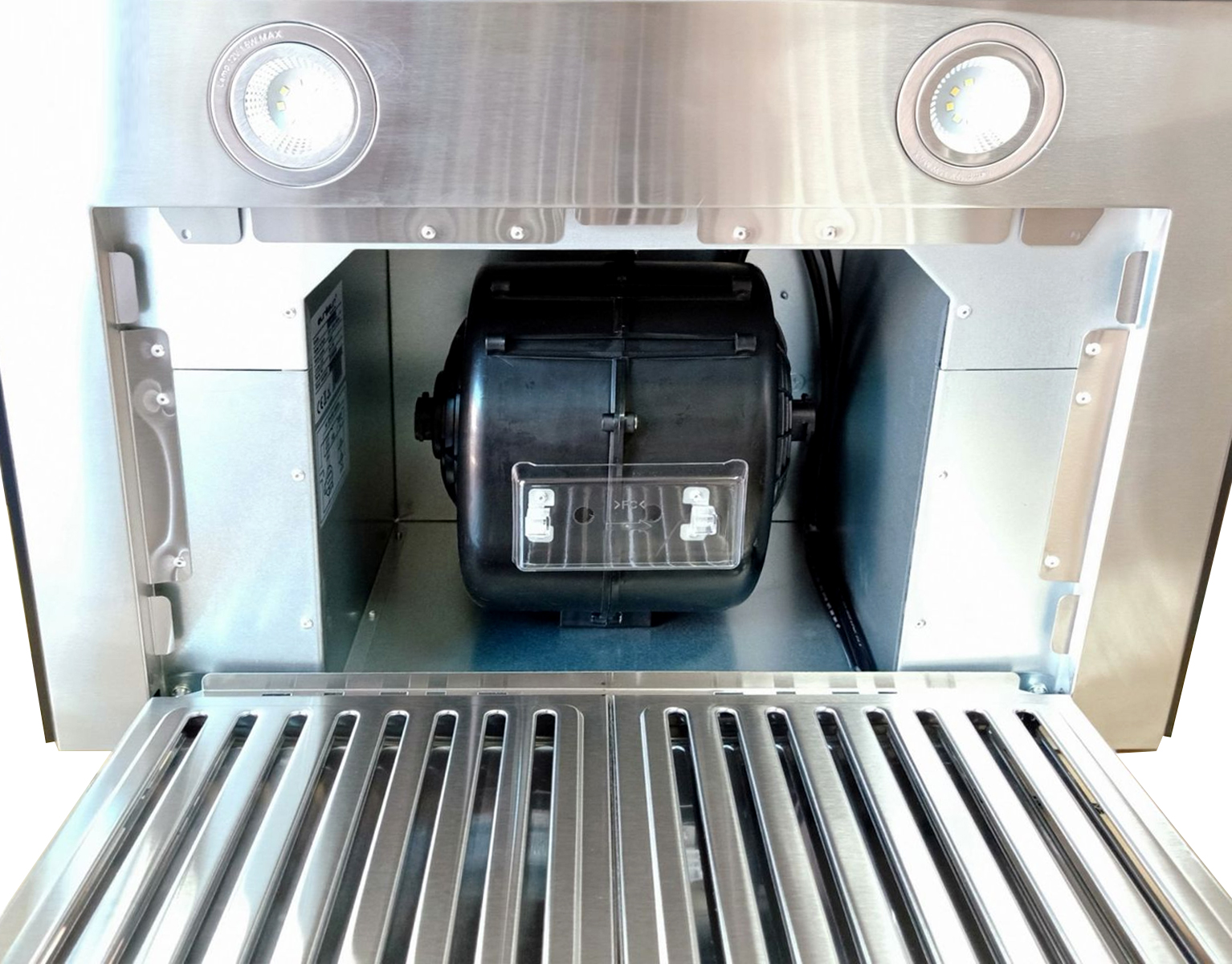 THÔNG SỐ KỸ THUẬT Chất liệu thân máy: Inox 304 Đèn led chiếu sáng: 2x50 W Kích thước: 700 x 500 ( 600/900) mm Ống xả: 150/125 mm Công suất động cơ: 240 W Áp