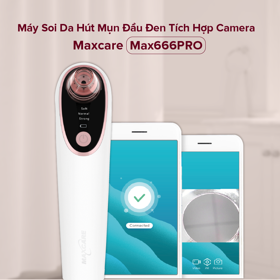 - Áp dụng tới ngày: 31/12/2022 Máy hút mụn đầu đen tích hợp CAMERA SOI DA Maxcare Max666PRO phiên bản HOT nhất hiện nay TRẢI NGHIỆM HÚT MỤN 4.0 CAMERA SIÊU THỰC MỚI NHẤT Max666PRO đem lại trải nghiệm làm sạch siêu thực với App sử dụng kính hiển vi không dây 1080P thông minh phóng đại X20 lần cho phép quan sát rõ tình trạng da. Kiểm soát vị trí mụn chỉ trong 1 giây giúp tăng gấp 10 lần hiệu quả hút mụn. Hút cực sạch, không bỏ sót và không làm tổn thương da. -------------------️------------------- APP ĐIỆN TỬ TRÊN ĐIỆN THOẠI, KẾT NỐI ĐỒNG BỘ VỚI CAMERA TRÊN MÁY HÚT MỤN Công nghệ tiện lợi, nhanh chóng, chân thực đem lại trải nghiệm chăm da hoàn hảo. Camera tích hợp đèn LED 6 vòng ánh sáng mang lại hiệu ứng hình ảnh sắc nét mọi lúc mọi nơi ️ Kết nốii Wifi Camera HD 1080px | Chụp ảnh/Video Phóng đại 20X Đèn Led 6 vòng -------------------️------------------- HIỆU QUẢ KHI SỬ DỤNG Máy hút mụn đầu đen soi da qua Camera Hút sạch Mụn đầu đen, mụn cám bã nhờn, dầu thừa Se khụt lỗ chân lông Tăng độ đàn hồi, Mềm mịn da Nâng cơ Trẻ hóa Giảm nếp nhăn Tẩy tế bào chết, Da sáng mịn, Giảm tiết dầu CHẾ ĐỘ HÚT 3 cấp độ hút tuỳ chỉnh theo nhu cầu sử dụng cá nhân: NHẸ, VỪA, CỰC MẠNH Kết hợp 3 đầu hút mụn đi kèm, lựa chọn mức độ hút phù hợp. 3 ĐẦU HÚT MỤN CHUYÊN DỤNG Đầu hút tròn lớn: Lực hút mạnh, dễ dàng hút sạch mụn đầu đen mụn trứng cá. Đầu hút Oval: Tăng độ đàn hồi, độ căng của da và giảm nếp nhăn hiệu quả Đầu hút tẩy da chết: Tẩy tế bào chết, hỗ trợ trẻ hoá, nâng cơ. -------------------️-------------------