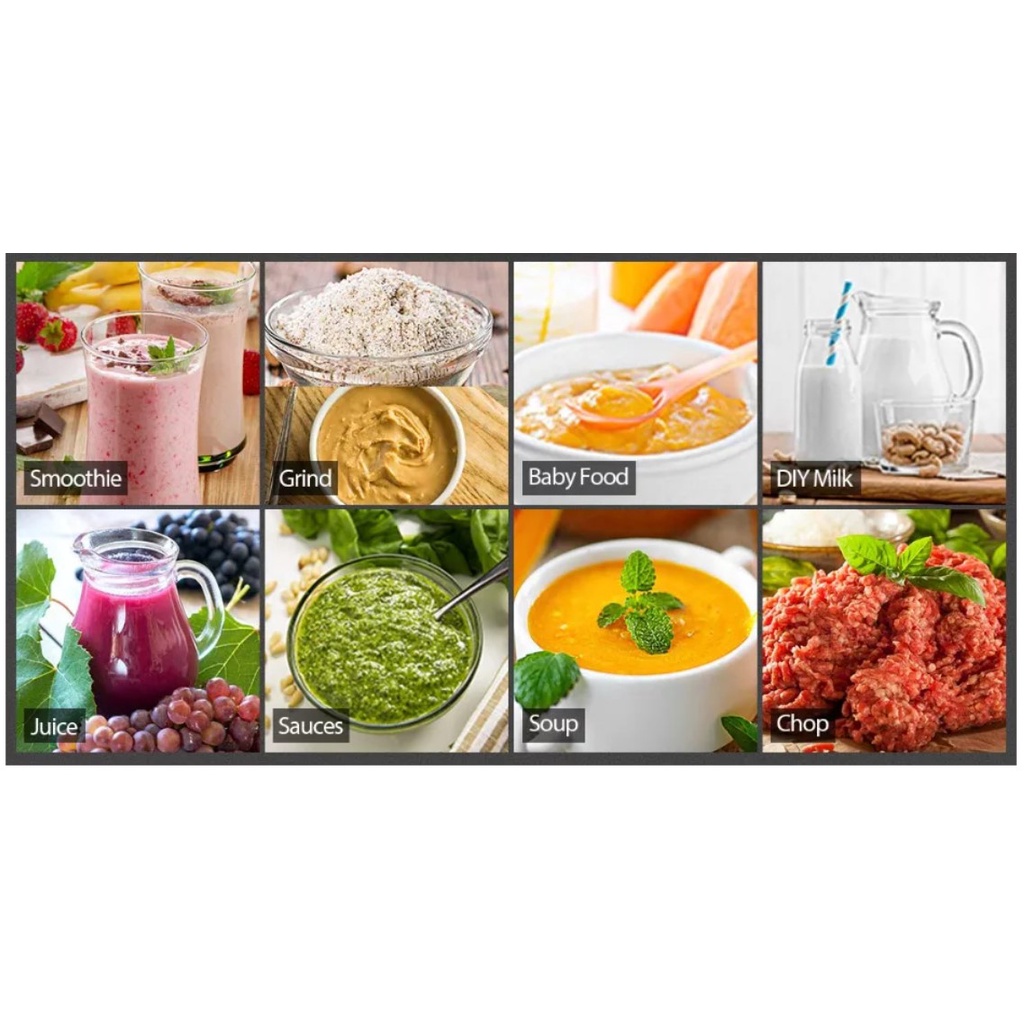 Điện áp : 220-240V/50Hz Năng lượng : A+ Công suất : 500W Lưỡi dao : 10 INOX 304 Dung tích: 800ml Điền khiển : cảm ứng tiếng việt Phụ kiện : Cốc đo, cốc hâm,